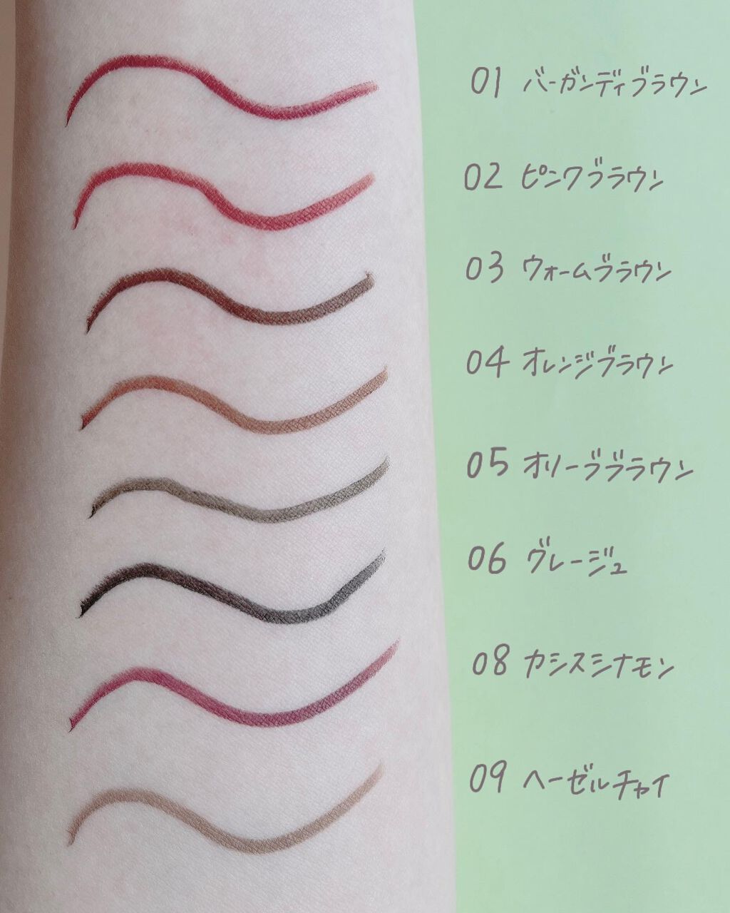 なめらかで本当に塗りやすく 1回塗りだとベースっぽくシアーに 2回以上重ね塗りするとしっかりに。 そして、よれない!! こすっても落ちにくく しっかり密着〜!!!って感じなので これからの暑い時期にも心強いです💪 どの色みも肌馴染みが良く ぎらつかないけれど艶っぽいカラー。なめらかな描き心地も本当に良いので ぜひ試してみてね🥰