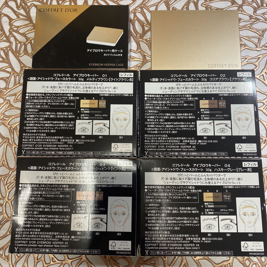- ぴたっとバームとふんわりパウダーで眉の毛流れ、立体感のある仕上がり※、続くシェーディングやアイシャドウにも使えるアイブロウパレット ※色の陰影によるメイクアップ効果による ぴたっと密着バーム&ふんわり定着パウダーの合わせ使いで、汗・マスク着用時の蒸気にも対応し、毛が生えていない部分も消えにくい、ウォータープルーフタイプ。 ● バームとパウダーの質感の使い分けで、より精密な毛流れや影を表現。 ● シェーディングやアイシャドウまで、顔中使えるマルチタイプ。 ● 使い心地にもこだわった特製ブラシ付き。 コフレドール アイブロウキーパー 全4 種 3.0g こちらの商品は詰め替え用〈レフィル〉です。別売りのアイブロウキーパー用ケースにセットしてお使いください。 アイブロウキーパー用ケース1種(税込770円 ※編集部調べ) 01メルティブラウン(ライトブラウン系) 02ココアブラウン(ブラウン系) 03アッシュピンク(ピンク系) 04ハスキーグレー(グレー系) <数量限定:初回限定版> シェーディングやアイシャドウにも使えるマルチタイプで、絶妙なニュアンスカラーを揃えたウォータープルーフタイプのアイブロウパレットのレフィルにケースがついた便利なセット。 セット内容 コフレドール アイブロウキーパー3.0ℊ(現品) コフレドール アイブロウキーパー用ケース(現品)