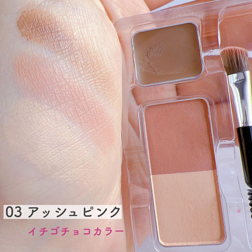 このパレットの1番の特徴は、「悪目立ちしない薄めの自然な色が1ミリの物足りなさもなくハッキリ色づく!」って感じの絶妙な色味と発色の良さだと思います。 あと、なめらかな粉質が抜群によくて肌に溶け込む。キメの整った立体感を作れるパレット。 02ウォームトーンだけ売り切れてるのをドンキやロフトでよく見かける通り、02ウォームトーンの色が抜群に綺麗! 02ウォームのマットハイライトは赤み抑えめなのにほのかな血色感が生まれていきいきした雰囲気になるし、下のきらきらジェルハイライトもつやんつやんのワンホンっぽい輝きですっごく可愛い。 右側のシェーディングは濃淡でグラデがつけやすく、ライティングの強さによってこのふたつで濃淡の調節がしやすいのも撮影現場ですごく助かってます。 捨て色のないパレットって貴重…!