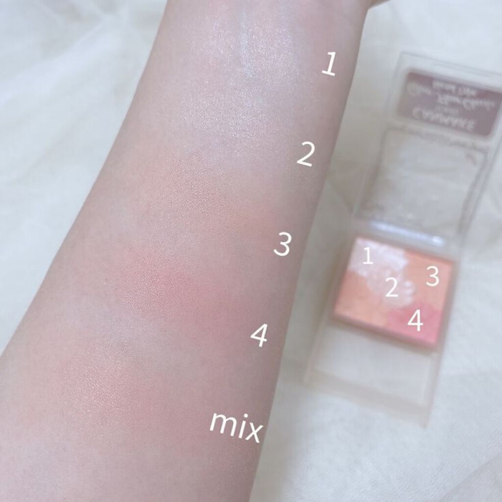 - ”発光ツヤ×透けマット”が1つに 混ぜ方次第で自分好みの仕上がりを作れる4色チーク 透け感のあるマットと繊細パール、2つの質感をブレンドして 肌に溶け込むような透けツヤ発色を楽しめるチーク。 しっとりなめらかなパウダーで、粉飛びしにくく、肌に密着します