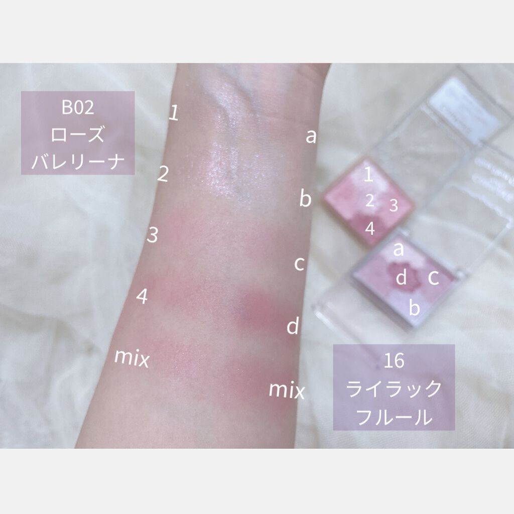 - <B01 コットンコーラル> トリイソステアリン酸ポリグリセリル-2、オクチルドデカノール、リンゴ酸ジイソステアリル、ヘキサ(ヒドロキシステアリン酸/ステアリン酸/ロジン酸)ジペンタエリスリチル、ミリスチン酸亜鉛、メタクリル酸メチルクロスポリマー、(HDI/トリメチロールヘキシルラクトン)クロスポリマー、テトライソステアリン酸ペンタエリスリチル、ビスジグリセリルポリアシルアジペート-2、ペンチレングリコール、フェノキシエタノール、シリカ、メチルパラベン、アルミナ、トコフェロール、ヒドロキシアパタイト、ポリメチルシルセスキオキサン、イソステアリン酸オクチルドデシル、水添ロジン酸ペンタエリスリチル、水、BG、エクトイン、ダマスクバラ花油、カニナバラ果実油、ヒアルロン酸Na、セラミドNP、ノイバラ果実エキス、ザクロ花エキス、トウキンセンカ花エキス、ローズマリー葉エキス、水溶性コラーゲン、ツボクサ葉エキス、タルク、合成フルオロフロゴパイト、酸化チタン、マイカ、酸化鉄、黄4、赤226、酸化スズ、ホホバエステル、トリヒドロキシステアリン <B02 ローズバレリーナ> トリイソステアリン酸ポリグリセリル-2、オクチルドデカノール、リンゴ酸ジイソステアリル、ヘキサ(ヒドロキシステアリン酸/ステアリン酸/ロジン酸)ジペンタエリスリチル、ミリスチン酸亜鉛、メタクリル酸メチルクロスポリマー、(HDI/トリメチロールヘキシルラクトン)クロスポリマー、テトライソステアリン酸ペンタエリスリチル、ビスジグリセリルポリアシルアジペート-2、ペンチレングリコール、フェノキシエタノール、シリカ、メチルパラベン、アルミナ、トコフェロール、ヒドロキシアパタイト、ポリメチルシルセスキオキサン、イソステアリン酸オクチルドデシル、水添ロジン酸ペンタエリスリチル、水、BG、エクトイン、ダマスクバラ花油、カニナバラ果実油、ヒアルロン酸Na、セラミドNP、ノイバラ果実エキス、ザクロ花エキス、トウキンセンカ花エキス、ローズマリー葉エキス、水溶性コラーゲン、ツボクサ葉エキス、タルク、合成フルオロフロゴパイト、マイカ、酸化チタン、酸化鉄、酸化スズ、赤226、ホホバエステル、グンジョウ、トリヒドロキシステアリン、赤202、マンガンバイオレット <B03 ラベンダードリーム> トリイソステアリン酸ポリグリセリル-2、オクチルドデカノール、リンゴ酸ジイソステアリル、ヘキサ(ヒドロキシステアリン酸/ステアリン酸/ロジン酸)ジペンタエリスリチル、ミリスチン酸亜鉛、メタクリル酸メチルクロスポリマー、(HDI/トリメチロールヘキシルラクトン)クロスポリマー、テトライソステアリン酸ペンタエリスリチル、ビスジグリセリルポリアシルアジペート-2、ペンチレングリコール、フェノキシエタノール、シリカ、メチルパラベン、アルミナ、トコフェロール、ヒドロキシアパタイト、ポリメチルシルセスキオキサン、イソステアリン酸オクチルドデシル、水添ロジン酸ペンタエリスリチル、水、BG、エクトイン、ダマスクバラ花油、カニナバラ果実油、ヒアルロン酸Na、セラミドNP、ノイバラ果実エキス、ザクロ花エキス、トウキンセンカ花エキス、ローズマリー葉エキス、水溶性コラーゲン、ツボクサ葉エキス、タルク、合成フルオロフロゴパイト、マイカ、酸化チタン、マンガンバイオレット、グンジョウ、酸化スズ、酸化鉄、赤226、赤202、ホホバエステル、トリヒドロキシステアリン、水酸化Al