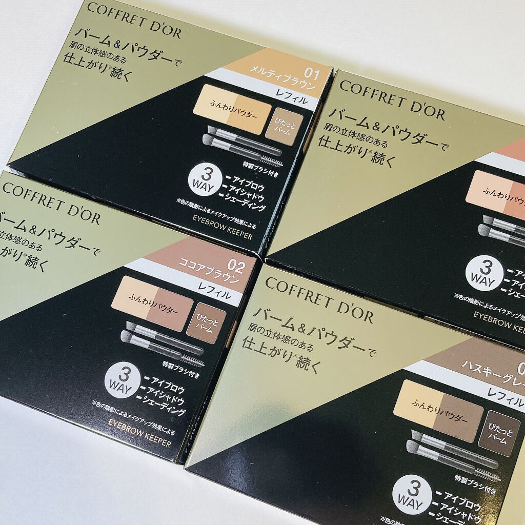 - ぴたっとバームとふんわりパウダーで眉の毛流れ、立体感のある仕上がり※、続くシェーディングやアイシャドウにも使えるアイブロウパレット ※色の陰影によるメイクアップ効果による ぴたっと密着バーム&ふんわり定着パウダーの合わせ使いで、汗・マスク着用時の蒸気にも対応し、毛が生えていない部分も消えにくい、ウォータープルーフタイプ。 ● バームとパウダーの質感の使い分けで、より精密な毛流れや影を表現。 ● シェーディングやアイシャドウまで、顔中使えるマルチタイプ。 ● 使い心地にもこだわった特製ブラシ付き。 コフレドール アイブロウキーパー 全4 種 3.0g こちらの商品は詰め替え用〈レフィル〉です。別売りのアイブロウキーパー用ケースにセットしてお使いください。 アイブロウキーパー用ケース1種(税込770円 ※編集部調べ) 01メルティブラウン(ライトブラウン系) 02ココアブラウン(ブラウン系) 03アッシュピンク(ピンク系) 04ハスキーグレー(グレー系) <数量限定:初回限定版> シェーディングやアイシャドウにも使えるマルチタイプで、絶妙なニュアンスカラーを揃えたウォータープルーフタイプのアイブロウパレットのレフィルにケースがついた便利なセット。 セット内容 コフレドール アイブロウキーパー3.0ℊ(現品) コフレドール アイブロウキーパー用ケース(現品)
