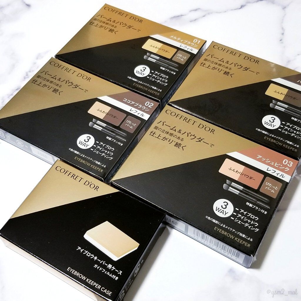 - ぴたっとバームとふんわりパウダーで眉の毛流れ、立体感のある仕上がり※、続くシェーディングやアイシャドウにも使えるアイブロウパレット ※色の陰影によるメイクアップ効果による ぴたっと密着バーム&ふんわり定着パウダーの合わせ使いで、汗・マスク着用時の蒸気にも対応し、毛が生えていない部分も消えにくい、ウォータープルーフタイプ。 ● バームとパウダーの質感の使い分けで、より精密な毛流れや影を表現。 ● シェーディングやアイシャドウまで、顔中使えるマルチタイプ。 ● 使い心地にもこだわった特製ブラシ付き。 コフレドール アイブロウキーパー 全4 種 3.0g こちらの商品は詰め替え用〈レフィル〉です。別売りのアイブロウキーパー用ケースにセットしてお使いください。 アイブロウキーパー用ケース1種(税込770円 ※編集部調べ) 01メルティブラウン(ライトブラウン系) 02ココアブラウン(ブラウン系) 03アッシュピンク(ピンク系) 04ハスキーグレー(グレー系) <数量限定:初回限定版> シェーディングやアイシャドウにも使えるマルチタイプで、絶妙なニュアンスカラーを揃えたウォータープルーフタイプのアイブロウパレットのレフィルにケースがついた便利なセット。 セット内容 コフレドール アイブロウキーパー3.0ℊ(現品) コフレドール アイブロウキーパー用ケース(現品)
