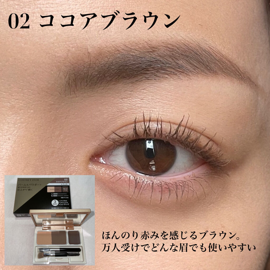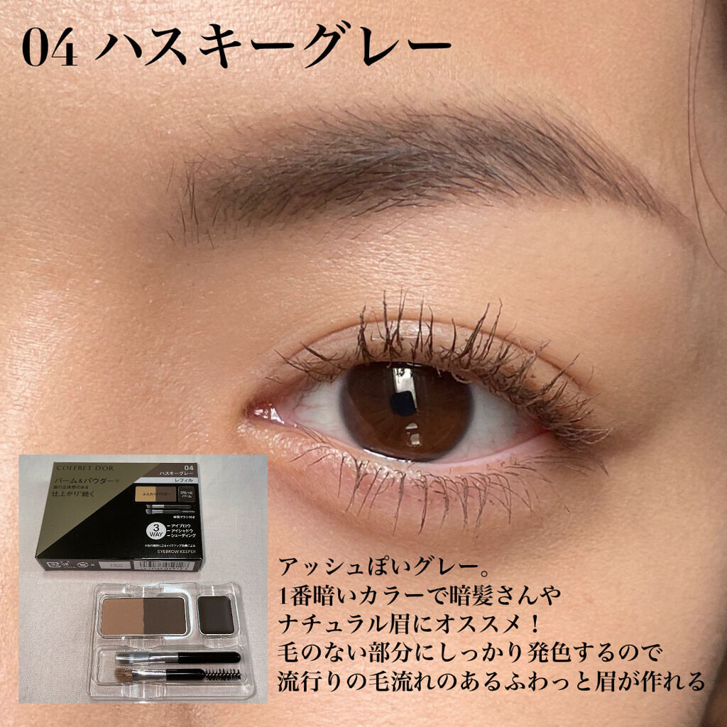 - ぴたっとバームとふんわりパウダーで眉の毛流れ、立体感のある仕上がり※、続くシェーディングやアイシャドウにも使えるアイブロウパレット ※色の陰影によるメイクアップ効果による ぴたっと密着バーム&ふんわり定着パウダーの合わせ使いで、汗・マスク着用時の蒸気にも対応し、毛が生えていない部分も消えにくい、ウォータープルーフタイプ。 ● バームとパウダーの質感の使い分けで、より精密な毛流れや影を表現。 ● シェーディングやアイシャドウまで、顔中使えるマルチタイプ。 ● 使い心地にもこだわった特製ブラシ付き。 コフレドール アイブロウキーパー 全4 種 3.0g こちらの商品は詰め替え用〈レフィル〉です。別売りのアイブロウキーパー用ケースにセットしてお使いください。 アイブロウキーパー用ケース1種(税込770円 ※編集部調べ) 01メルティブラウン(ライトブラウン系) 02ココアブラウン(ブラウン系) 03アッシュピンク(ピンク系) 04ハスキーグレー(グレー系) <数量限定:初回限定版> シェーディングやアイシャドウにも使えるマルチタイプで、絶妙なニュアンスカラーを揃えたウォータープルーフタイプのアイブロウパレットのレフィルにケースがついた便利なセット。 セット内容 コフレドール アイブロウキーパー3.0ℊ(現品) コフレドール アイブロウキーパー用ケース(現品)