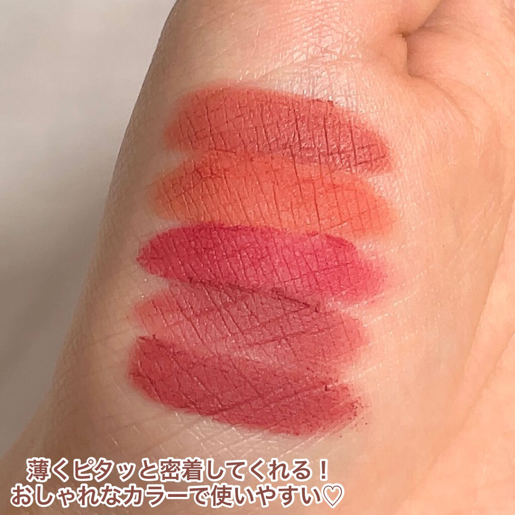 - リアルなバターのようなテクスチャーのマットティント。 シアバターなどの保湿成分配合で、マットリップなのに乾燥しにくい。 ふんわり軽く唇に密着する心地よい付け心地!