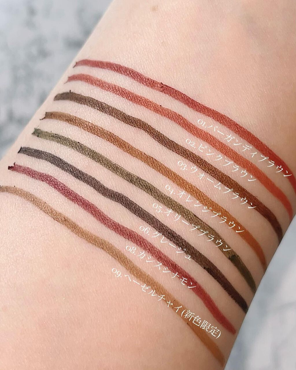 - <02 ピンクブラウン> トリメチルシロキシケイ酸、メチルトリメチコン、ポリエチレン、(アクリレーツ/アクリル酸ステアリル/メタクリル酸ジメチコン)コポリマー、カルナウバロウ、キャンデリラロウ、スクワラン、ホホバ種子油、トリイソステアリン酸ポリグリセリル-2、水酸化Al、ジメチコン、トコフェロール、酸化鉄、酸化チタン、マイカ、グンジョウ <03 ウォームブラウン> トリメチルシロキシケイ酸、メチルトリメチコン、ポリエチレン、(アクリレーツ/アクリル酸ステアリル/メタクリル酸ジメチコン)コポリマー、カルナウバロウ、キャンデリラロウ、スクワラン、ホホバ種子油、トリイソステアリン酸ポリグリセリル-2、ジメチコン、トコフェロール、水酸化Al、酸化鉄、マイカ、酸化チタン、グンジョウ <04 オレンジブラウン> トリメチルシロキシケイ酸、メチルトリメチコン、ポリエチレン、(アクリレーツ/アクリル酸ステアリル/メタクリル酸ジメチコン)コポリマー、カルナウバロウ、キャンデリラロウ、スクワラン、ホホバ種子油、トリイソステアリン酸ポリグリセリル-2、ジメチコン、水酸化Al、トコフェロール、酸化鉄、グンジョウ、マイカ、酸化チタン <06 グレージュ> トリメチルシロキシケイ酸、メチルトリメチコン、ポリエチレン、(アクリレーツ/アクリル酸ステアリル/メタクリル酸ジメチコン)コポリマー、カルナウバロウ、キャンデリラロウ、スクワラン、ホホバ種子油、トリイソステアリン酸ポリグリセリル-2、水酸化Al、ジメチコン、トコフェロール、酸化鉄、酸化チタン、マイカ、グンジョウ <09 ヘーゼルチャイ> イソドデカン、トリメチルシロキシケイ酸、合成ワックス、(アクリレーツ/アクリル酸ステアリル/メタクリル酸ジメチコン)コポリマー、カルナウバロウ、ジフェニルシロキシフェニルトリメチコン、スクワラン、ホホバ種子油、ジメチコン、水酸化Al、トコフェロール、酸化鉄、酸化チタン、マイカ、グンジョウ <18 アプリコットブラウン> イソドデカン、トリメチルシロキシケイ酸、合成ワックス、(アクリレーツ/アクリル酸ステアリル/メタクリル酸ジメチコン)コポリマー、カルナウバロウ、ジフェニルシロキシフェニルトリメチコン、ホウケイ酸(Ca/Al)、スクワラン、ホホバ種子油、ジメチコン、水酸化Al、トコフェロール、酸化スズ、酸化鉄、マイカ、酸化チタン、グンジョウ <19 インディゴブラック> イソドデカン、トリメチルシロキシケイ酸、合成ワックス、(アクリレーツ/アクリル酸ステアリル/メタクリル酸ジメチコン)コポリマー、カルナウバロウ、ジフェニルシロキシフェニルトリメチコン、ジメチコン、トコフェロール、スクワラン、ホホバ種子油、水酸化Al、酸化鉄、マイカ、グンジョウ、酸化チタン、ホウケイ酸(Ca/Al)、酸化スズ <01 バーガンディブラウン> トリメチルシロキシケイ酸、メチルトリメチコン、ポリエチレン、(アクリレーツ/アクリル酸ステアリル/メタクリル酸ジメチコン)コポリマー、カルナウバロウ、キャンデリラロウ、スクワラン、ホホバ種子油、トリイソステアリン酸ポリグリセリル-2、水酸化Al、ジメチコン、トコフェロール、酸化鉄、グンジョウ、酸化チタン、マイカ <05 オリーブブラウン> トリメチルシロキシケイ酸、メチルトリメチコン、ポリエチレン、(アクリレーツ/アクリル酸ステアリル/メタクリル酸ジメチコン)コポリマー、カルナウバロウ、キャンデリラロウ、スクワラン、ホホバ種子油、トリイソステアリン酸ポリグリセリル-2、ジメチコン、トコフェロール、水酸化Al、酸化鉄、グンジョウ、マイカ、酸化チタン <08 カシスシナモン> カシスシナモン トリメチルシロキシケイ酸、メチルトリメチコン、ポリエチレン、(アクリレーツ/アクリル酸ステアリル/メタクリル酸ジメチコン)コポリマー、カルナウバロウ、キャンデリラロウ、スクワラン、ホホバ種子油、トリイソステアリン酸ポリグリセリル-2、水酸化Al、ジメチコン、トコフェロール、酸化鉄、グンジョウ、酸化チタン、マイカ <10 ピスタチオキャメル> トリメチルシロキシケイ酸、メチルトリメチコン、ポリエチレン、(アクリレーツ/アクリル酸ステアリル/メタクリル酸ジメチコン)コポリマー、カルナウバロウ、トリイソステアリン酸ポリグリセリル-2、キャンデリラロウ、スクワラン、ホホバ種子油、ジメチコン、水酸化Al、トコフェロール、マイカ、酸化鉄、酸化チタン、グンジョウ、コンジョウ <11 ロゼウッド> トリメチルシロキシケイ酸、メチルトリメチコン、ポリエチレン、(アクリレーツ/アクリル酸ステアリル/メタクリル酸ジメチコン)コポリマー、カルナウバロウ、トリイソステアリン酸ポリグリセリル-2、キャンデリラロウ、スクワラン、ホホバ種子油、ジメチコン、水酸化Al、トコフェロール、マイカ、酸化鉄、酸化チタン <13 ミモザブラウン> トリメチルシロキシケイ酸、メチルトリメチコン、合成ワックス、(アクリレーツ/アクリル酸ステアリル/メタクリル酸ジメチコン)コ