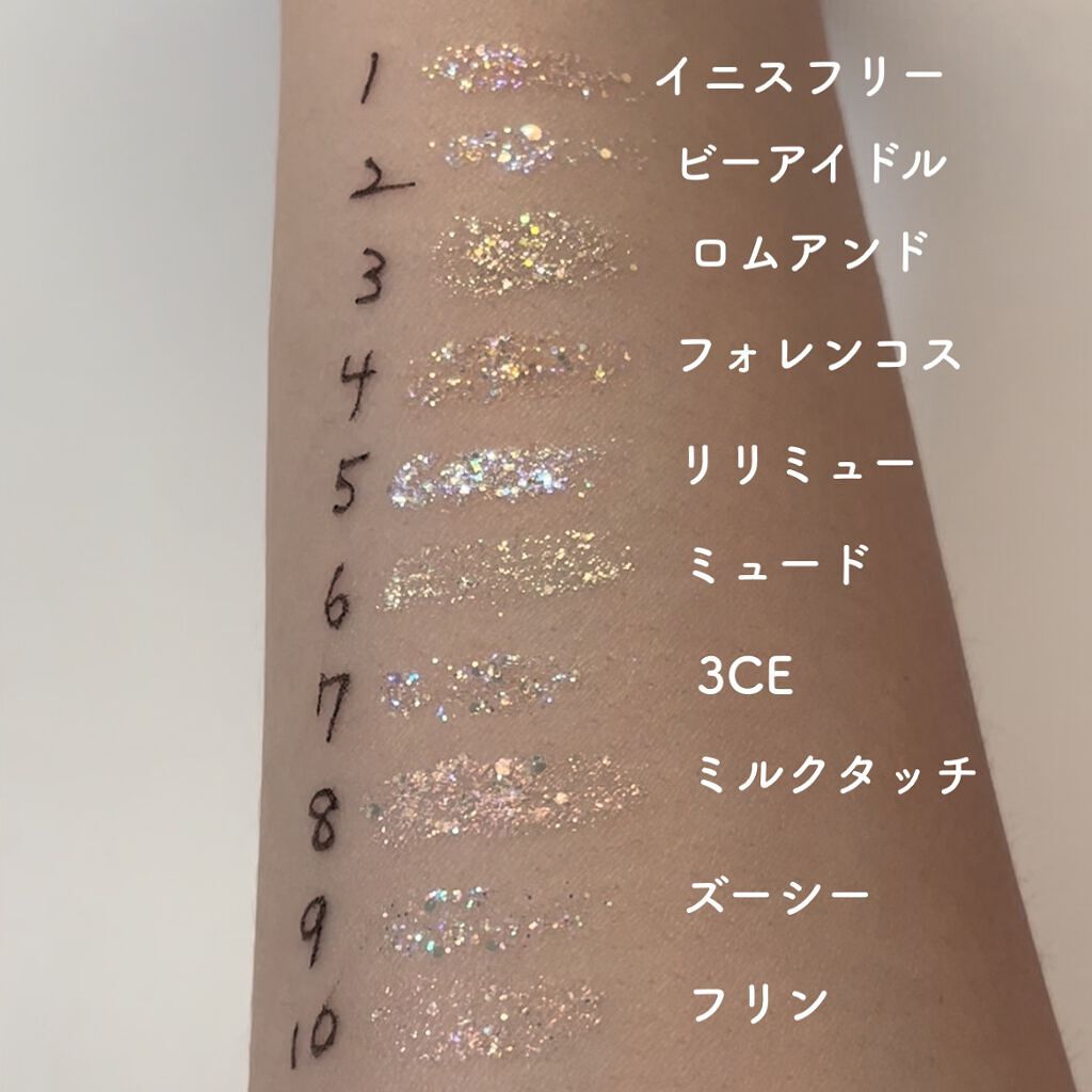 💎Ririmewピックミーアイズグリッター01ブライトミー¥1540 💎3CE EYE SWITCH #DOUBLE NOTE¥1610 💎B IDOLグリッターライナー02ミルク ウェイ¥990 💎PERIPERAシュガー トゥインクル リキッド グリッター GLITTER WAVE¥660 💎rom&ndリキッド グリッター シャドウ #01 スターダスト¥1100 💎COLORKEY スパークリングギャラクシーリキッドアイシャドウC05星降るウミ¥1350 💎BLACK ROUGE パールブリーアイグリッター G02あまいコンペイトウ¥1781 💎rom&nd リキッド グリッター シャドウ #02 ローズスター¥1100