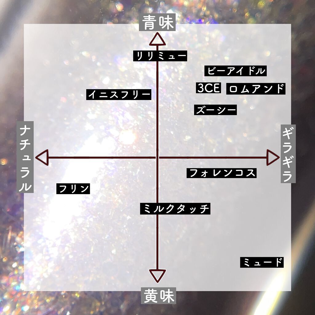 【耐久力】🥇ロムアンド🥈リリミュー、ズーシー🥉イニスフリー、フォレンコス 【塗りやすさ】🥇3CE🥈ズーシー🥉イニスフリー、ビーアイドル 【ホロの大きさ】🥇ミルクタッチ🥈フォレンコス🥉ビーアイドル 【派手】🥇3CE🥈ロムアンド🥉ミュード 【ナチュラル】🥇リリミュー🥈フリン🥉イニスフリー 【個人的お気に入り】🥇3CE🥈イニスフリー🥉フォレンコス、ビーアイドル