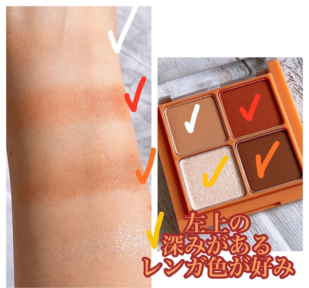 PK01ローズフォグの方が全体的に淡い、ピンクより。 ベターザンアイズ02ドライローズの方がコーラルよりです。 ラメは、ローズフォグの方が、パールも入って華やかです。 締め色は、黄色にも赤みにも寄らないブラウンです。 ベターザンアイズ03ドライラグラスは、黄色味が強いです。 ラメは、ベースカラーの発色は控えめでラメ感が強いです。 &nd by rom&ndメロウアイパレットBR02アップルシナモンは、全体的にオレンジ寄りです。 ラメは、パールのベースにラメで華やかです。 rom&ndベターザンアイズミュージックシリーズ#M01ドライアップルブロッサムは、テラコッタです。 ラメのベースカラーはほぼ発色せず、多色ラメです。