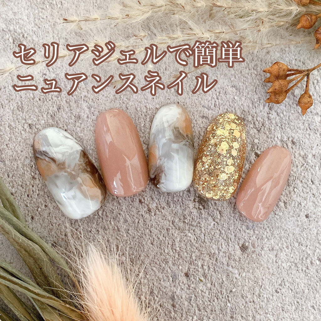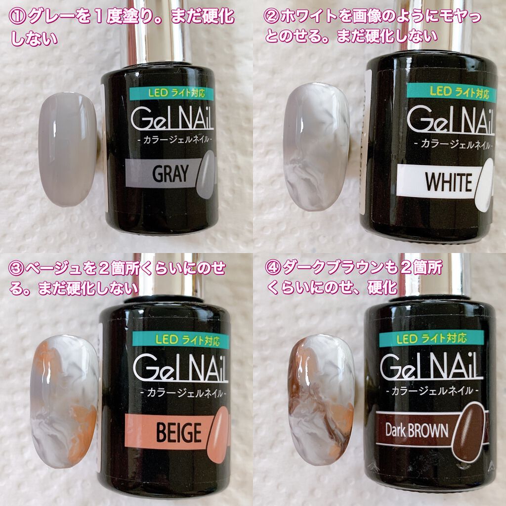ブラウンレッドはシアーカラーなので、ニュアンスにとても使いやすい❣️ グレージュを塗り硬化をせずに、ブラウンレッドを刷毛でさーっと塗るだけで簡単に模様が出来ちゃいます✨ 刷毛圧をかけずに、軽くジェルの上澄みだけを移動させるような感じで塗るのがポイントです🥰