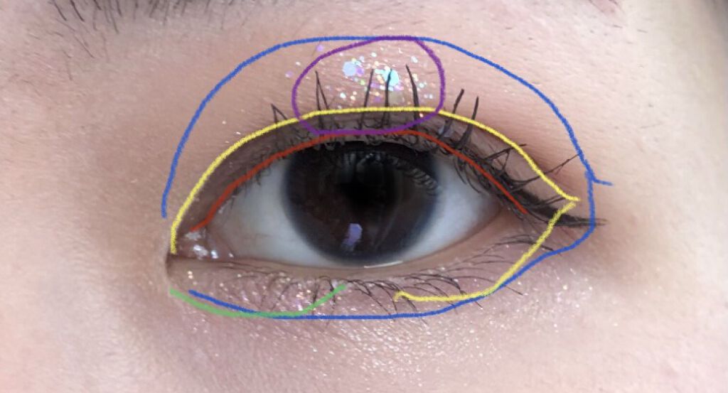 ・①をアイホール全体、下まぶた・②を二重幅よりややオーバーに・③を下まぶた目頭〜目尻へ徐々に太くなる様に・④を上まぶたの黒目外側の縁〜目尻へ②に被せる様に塗り、下まぶたの黒目外側の縁〜目尻へ・⑤を上まぶたの黒目外側の縁〜アイラインを描く本来の...