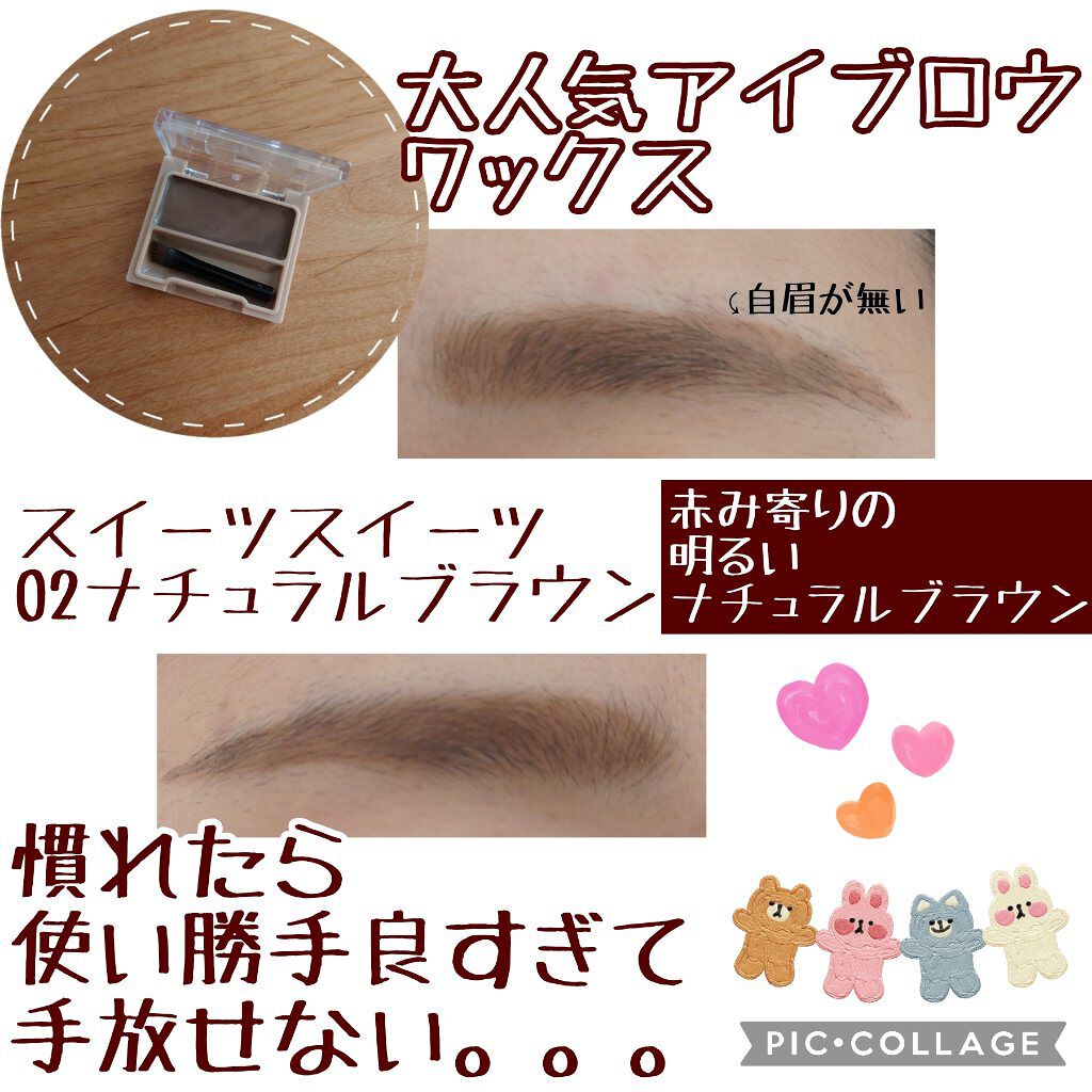 【使った商品】sweetssweetsスウィーツスウィーツアイブロウワックス01アッシュブラウン02ナチュラルブラウン【色味】01は濃いブラウン02は明るいブラウン【発色】ワックスなのでとても良い◎【色もち】眉毛が無い私でも落ちない一応眉毛に...