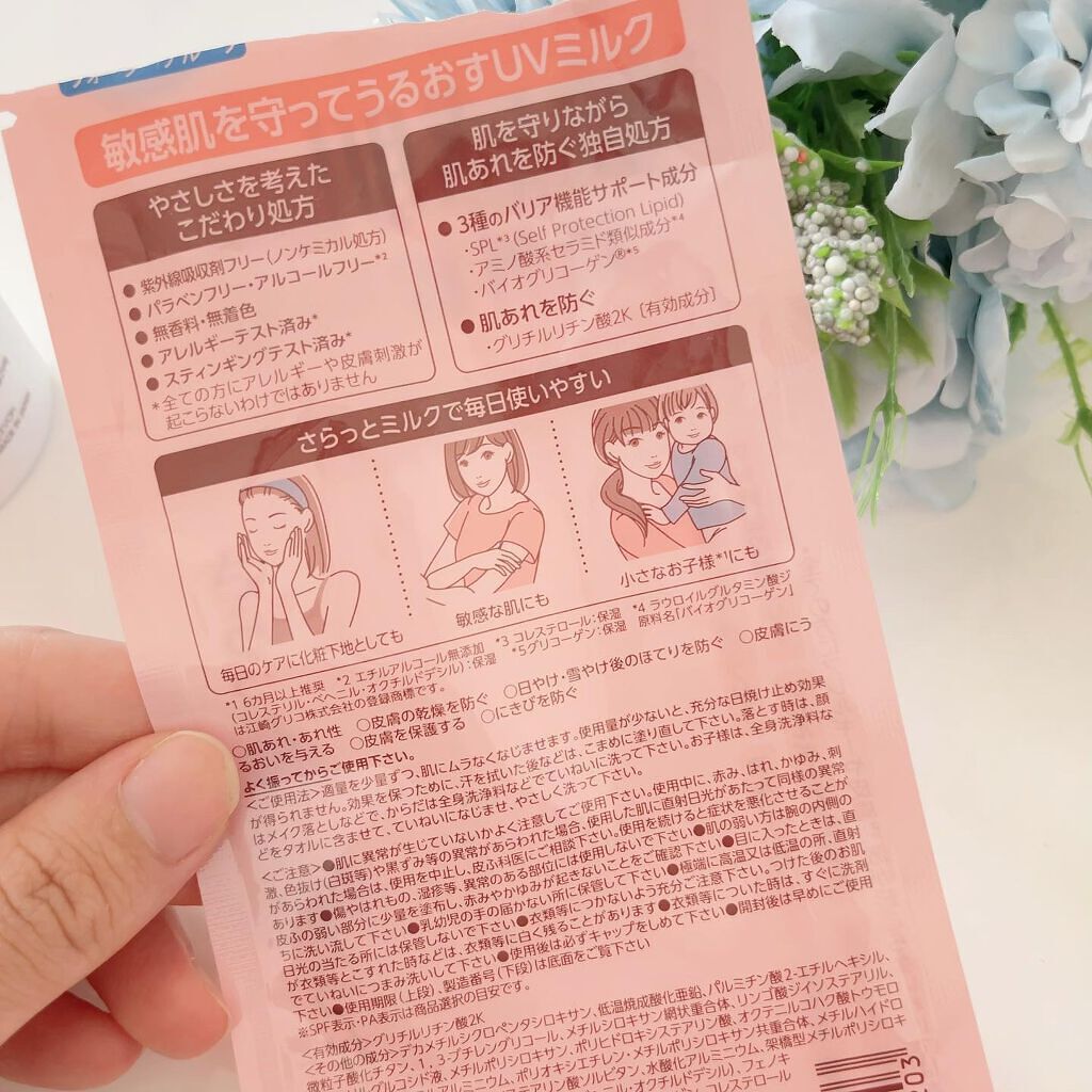 - <ミノンUVマイルドミルク> グリチルリチン酸2K、デカメチルシクロペンタシロキサン、低温焼成酸化亜鉛、パルミチン酸2-エチルヘキシル、微粒子酸化チタン、1,3-ブチレングリコール、メチルシロキサン網状重合体、リンゴ酸ジイソステアリル、グリセリルグルコシド液、メチルポリシロキサン、ポリヒドロキシステアリン酸、オクテニルコハク酸トウモロコシデンプンエステルアルミニウム、ポリオキシエチレン・メチルポリシロキサン共重合体、メチルハイドロジェンポリシロキサン、セスキイソステアリン酸ソルビタン、水酸化アルミニウム、架橋型メチルポリシロキサン、ラウロイルグルタミン酸ジ(コレステリル・ベヘニル・オクチルドデシル)、フェノキシエタノール、セスキオレイン酸ソルビタン、含水ケイ酸、グリコーゲン、コレステロール