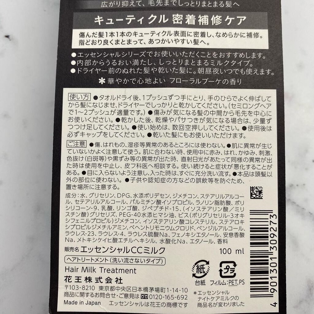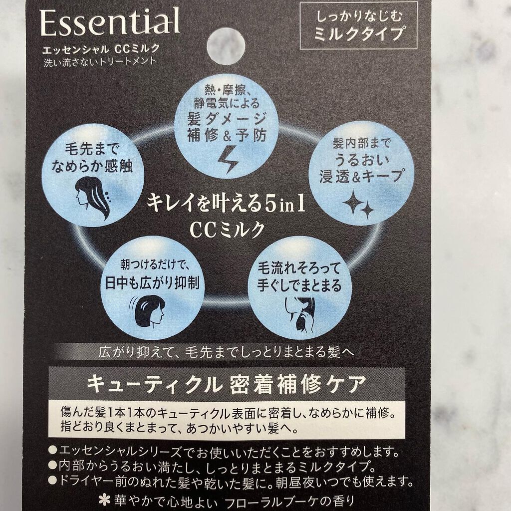 エッセンシャルCCミルク『広がり抑えて、毛先までしっとりまとまる髪へ』キレイを叶える5in1🤍①熱・ダメージによる髪ダメージ補修&予防②うるおい浸透&キープ③毛先までなめらか④日中も広がり抑制⑤手ぐしでまとまる・キューティクル密着補修ケア・内...