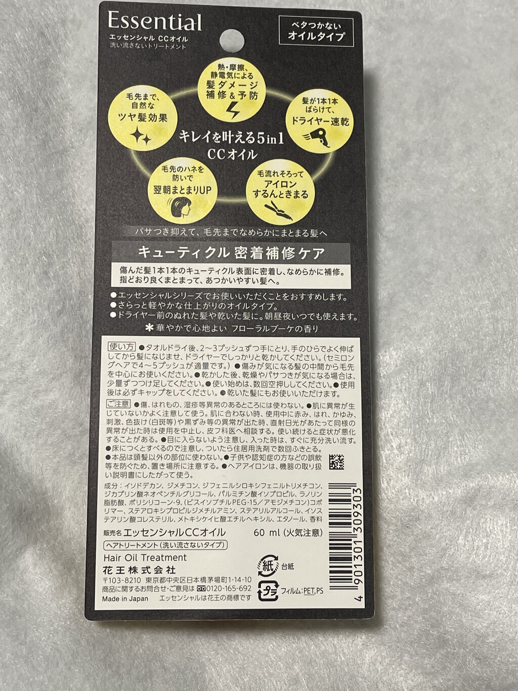 ※2023年使用品ヘアオイル・商品名エッセンシャルCCオイル・値段定価924円(438円で購入)・購入場所ドンキ・評価★☆☆☆☆プレミアムヘアオイル茶色のボトルのより合わなかったこれも数回使って諦めたエッセンシャル全般合わないからそんな気はし...