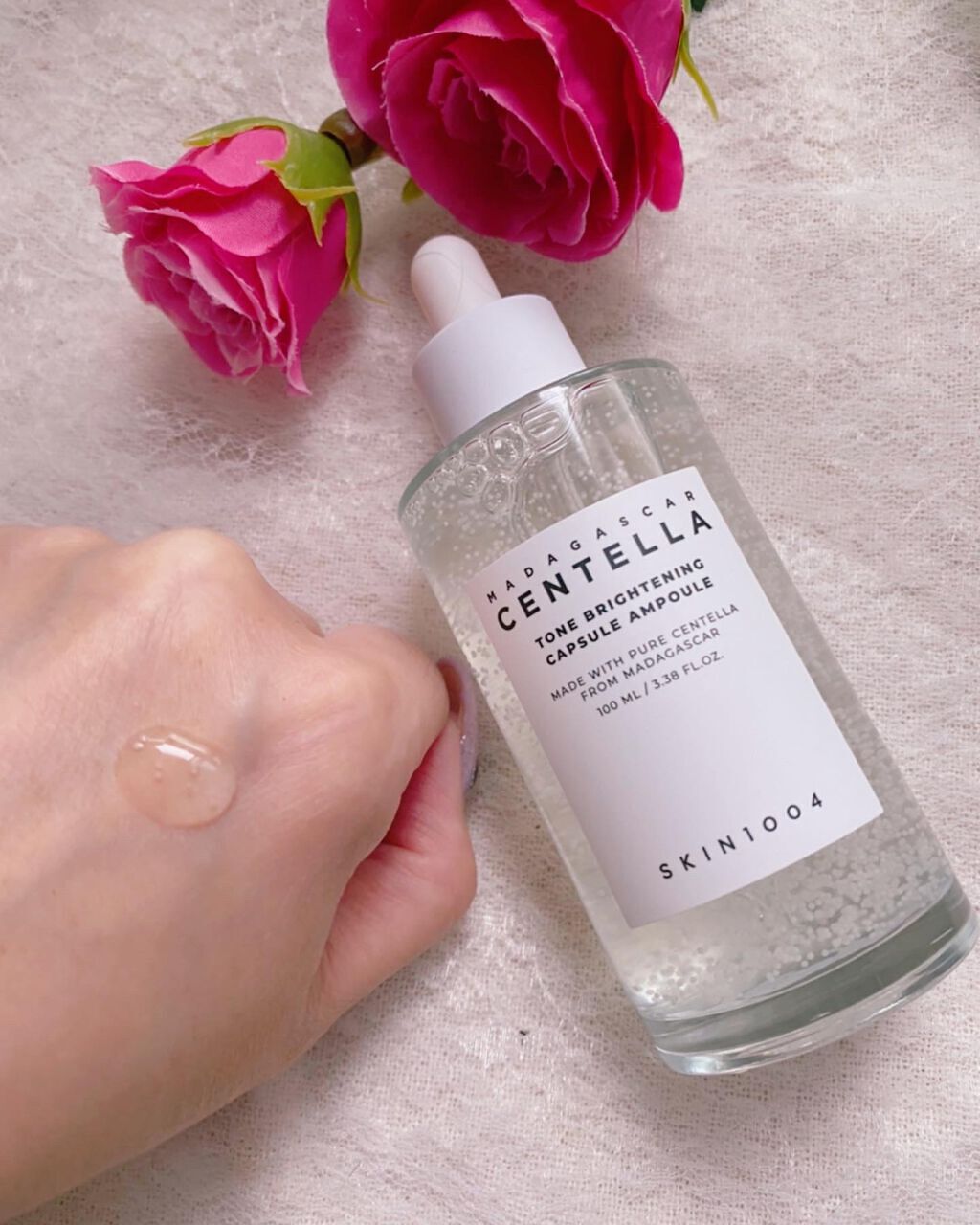 敏感肌でも明るく輝く肌へ導く美容液.ᐟ.ᐟ 輝く透明感”✕鎮静*=SKIN1004トーンブライトニング CICA成分”が肌をやさしく鎮静”し 明るく輝くツヤ肌を叶えるSKIN1004トーンブライトニングライン◡̈⋆ 少しトロッとしたテクスチャーで、とても伸びが良いです◎ 中に白いカプセルが沢山入っていて、肌に乗せて馴染ませていくと、だんだんカプセルが溶け出してお肌に浸透していってくれます.ᐟ.ᐟ