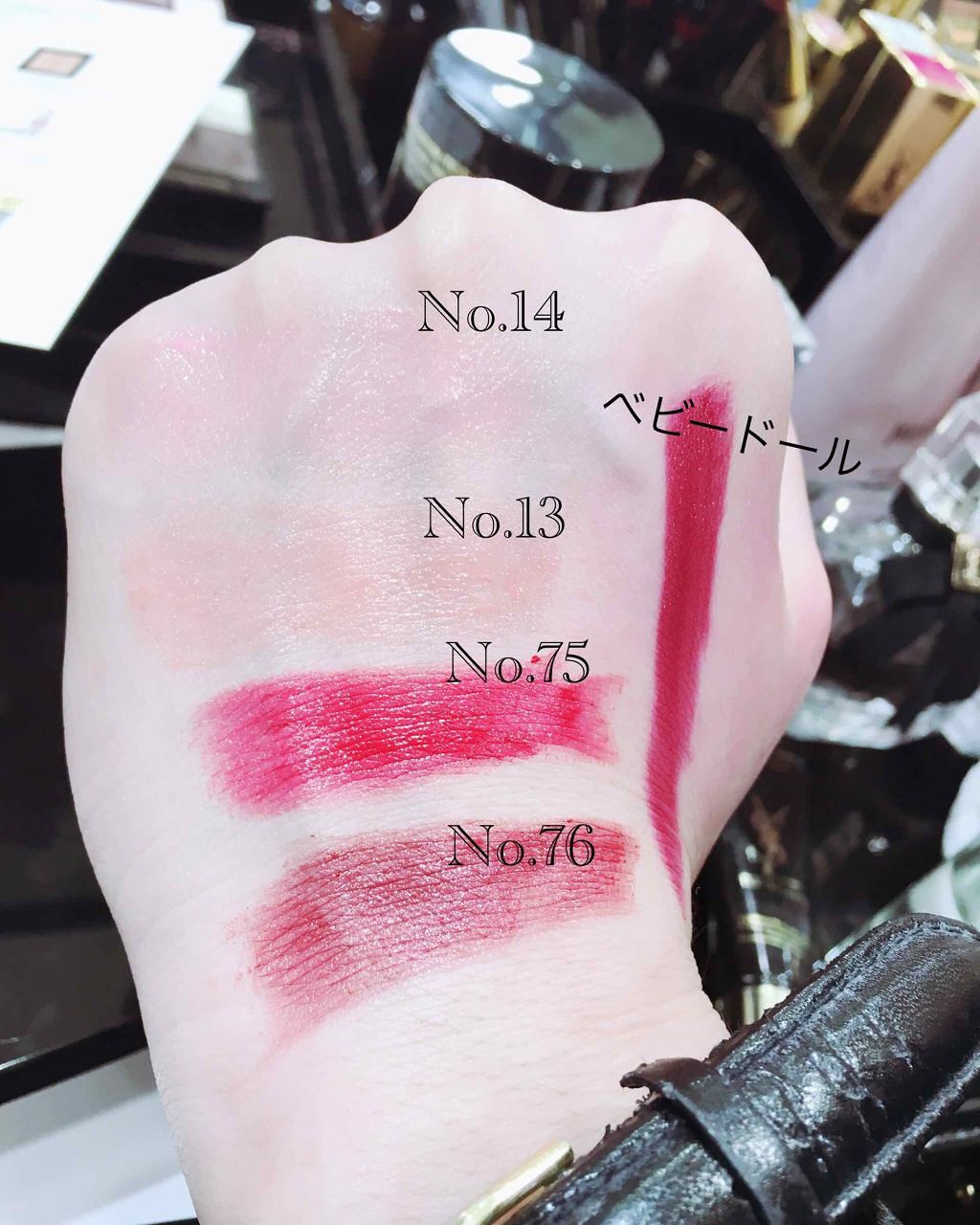YSLイヴ・サンローランSummerコレクション限定カラーリップ本日から発売のSummerコレクション!限定で出ている4本全て可愛くて購入しました❤ティントインバームの方は唇にのせての写真があまり変わらず伝わらなかったので手にのせた写真のみに...