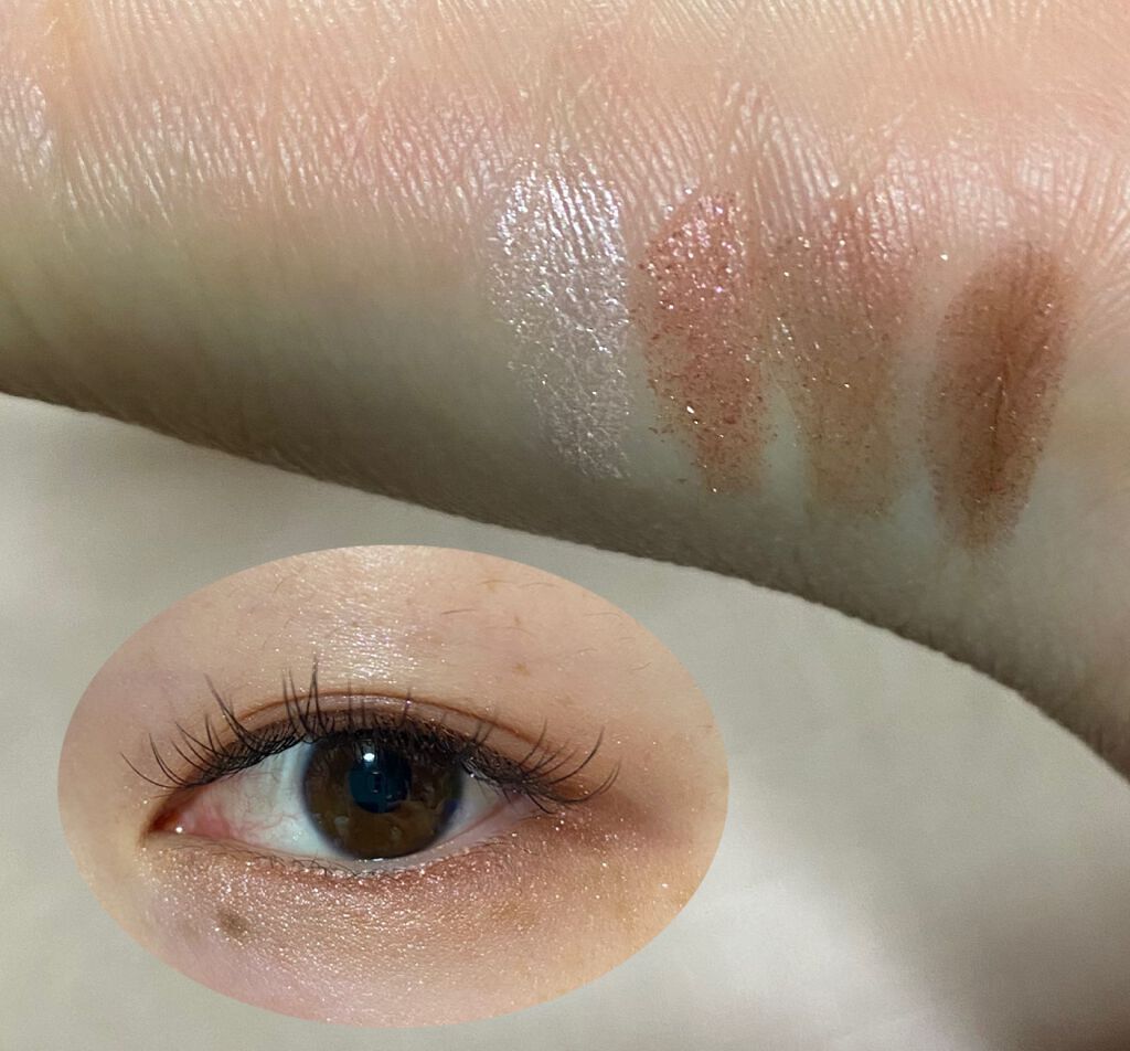 粉質が柔らかいので、優しい力で瞼に乗せられる 色味は濃すぎないので柔らかい印象で使える ブラウンメイクもピンクメイクも使い方によってはどちらも出来る! ブラウンに程よいピンクの色味が入っているので、可愛らしい印象になれる!