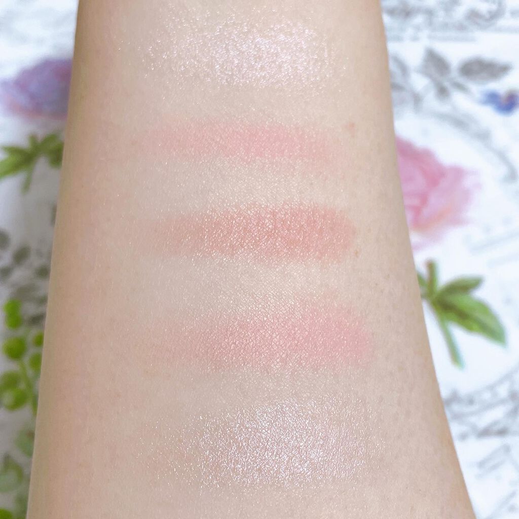 コーラルベース × ゴールドパール × ホワイトパールの3色の組み合わせです!! コーラル系がベースなので日本人の肌に とても馴染むと思います! こちらも薄付きなのでチークは勿論ハイライトとしても使用出来ます! 下瞼から目尻に掛けて塗ればマスク生活でも華やかな目元に仕上がります! コーラル系なので肌を白く見せてくれる色味だと思いました! 使用感も柔かく しっとりしているので保湿効果もあります! デイリーメイクに使いやすい色だと思いました。 目元とリップに重ねると顔全体が統一感が出るので可愛いく仕上げる事が出来ます♡ 写真よりも実際は色味が もっとしっかり出るのでその日の気分によって色の濃さを調整しやすいと思います!
