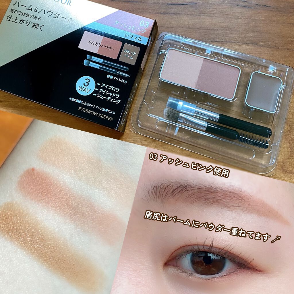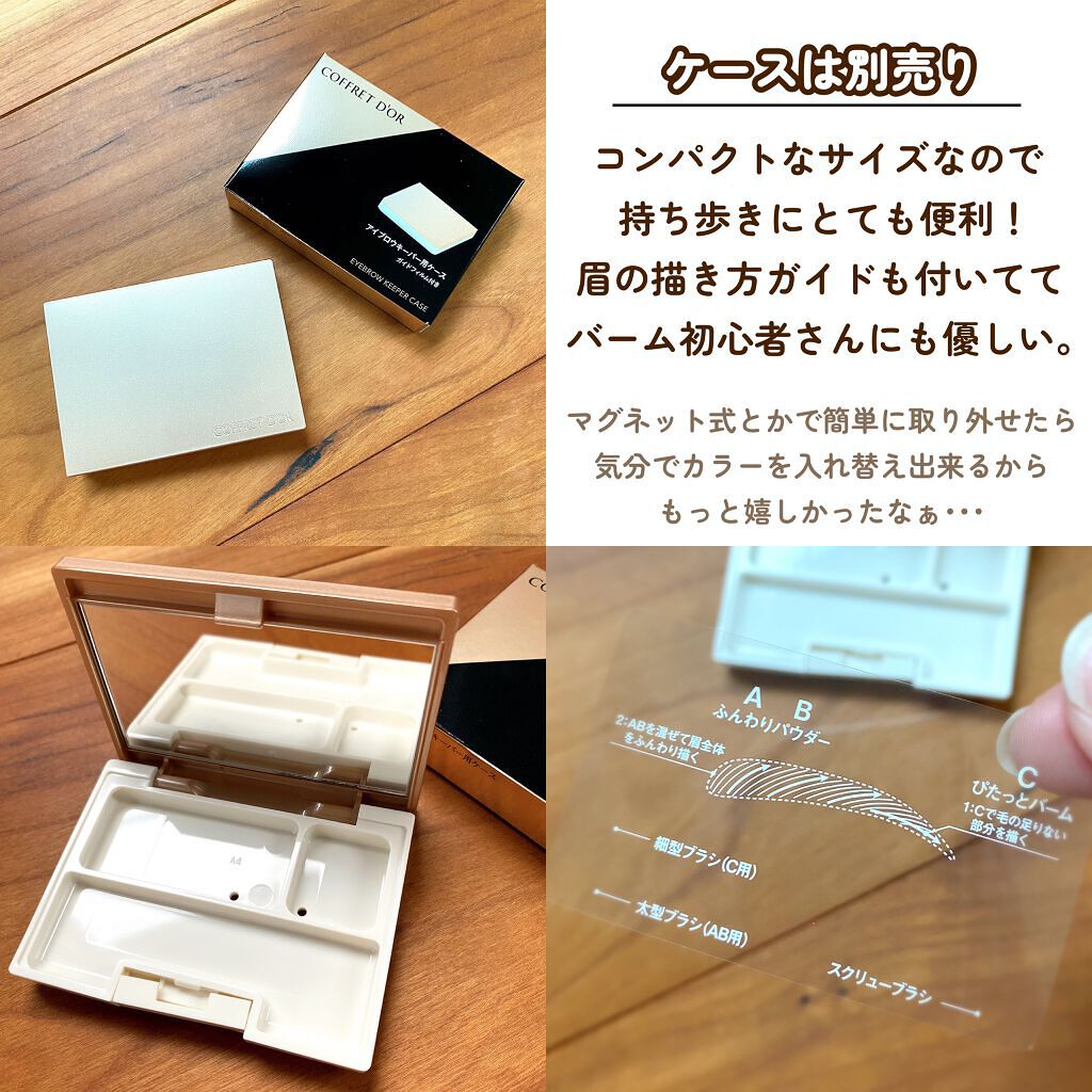 - ぴたっとバームとふんわりパウダーで眉の毛流れ、立体感のある仕上がり※、続くシェーディングやアイシャドウにも使えるアイブロウパレット ※色の陰影によるメイクアップ効果による ぴたっと密着バーム&ふんわり定着パウダーの合わせ使いで、汗・マスク着用時の蒸気にも対応し、毛が生えていない部分も消えにくい、ウォータープルーフタイプ。 ● バームとパウダーの質感の使い分けで、より精密な毛流れや影を表現。 ● シェーディングやアイシャドウまで、顔中使えるマルチタイプ。 ● 使い心地にもこだわった特製ブラシ付き。 コフレドール アイブロウキーパー 全4 種 3.0g こちらの商品は詰め替え用〈レフィル〉です。別売りのアイブロウキーパー用ケースにセットしてお使いください。 アイブロウキーパー用ケース1種(税込770円 ※編集部調べ) 01メルティブラウン(ライトブラウン系) 02ココアブラウン(ブラウン系) 03アッシュピンク(ピンク系) 04ハスキーグレー(グレー系) <数量限定:初回限定版> シェーディングやアイシャドウにも使えるマルチタイプで、絶妙なニュアンスカラーを揃えたウォータープルーフタイプのアイブロウパレットのレフィルにケースがついた便利なセット。 セット内容 コフレドール アイブロウキーパー3.0ℊ(現品) コフレドール アイブロウキーパー用ケース(現品)