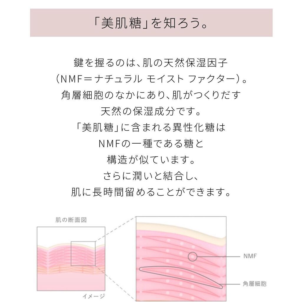 - みずみずしく、透き通る。「美肌糖」の透明感。 キメひとつひとつまでふっくらやわらげ、吸い付くような弾力感をかなえる乳液。