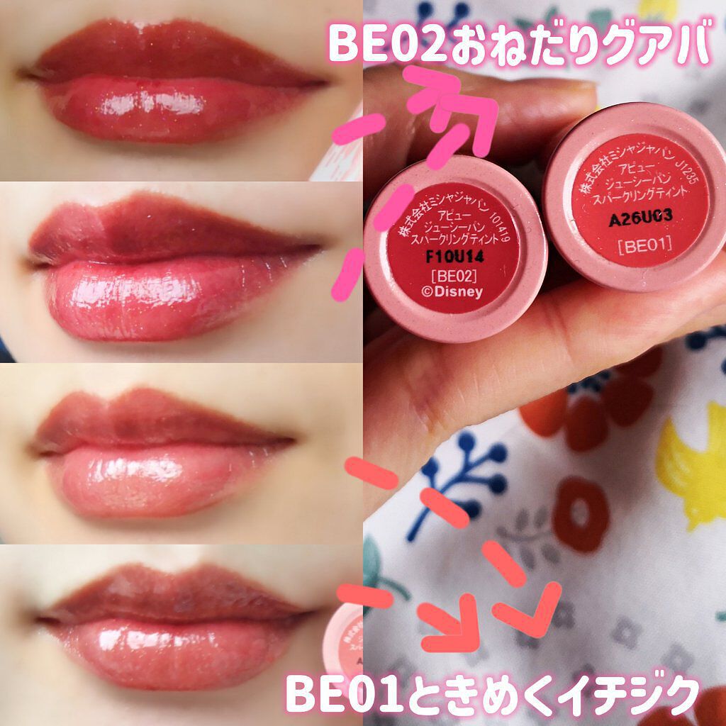 ラメがめちゃくちゃ可愛いA’pieuのジューシーパン スパークリングティント。BE01のときめくイチジクはベースがベージュ系のナチュラルカラーでゴールドやホワイト系のラメが入っています! 普段から濃いめのリップが好きな方は物足りないと感じると思うので、こちらを全体的に塗った上に内側に濃いめのリップ塗ってもとても可愛く仕上がります🫶🏻 ティント効果もあって、ティッシュオフするとツヤ感は失われるものの色とラメはしっかり残ります!