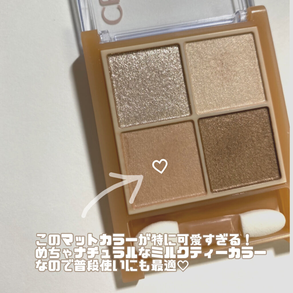 - ラメ・パール・マット3質感の4色アイシャドウ。 肌馴染みの良いベージュを基調としたカラー。ラメ・パール・マットの3質感を重ねて、自然にまぶたを強調し奥行のある大きな目元へ。 しっとり溶け込むような柔らかなパウダーなので、スルスル伸びてまぶたにピタッと密着。保湿成分(スクワラン・ホホバ種子油)配合。