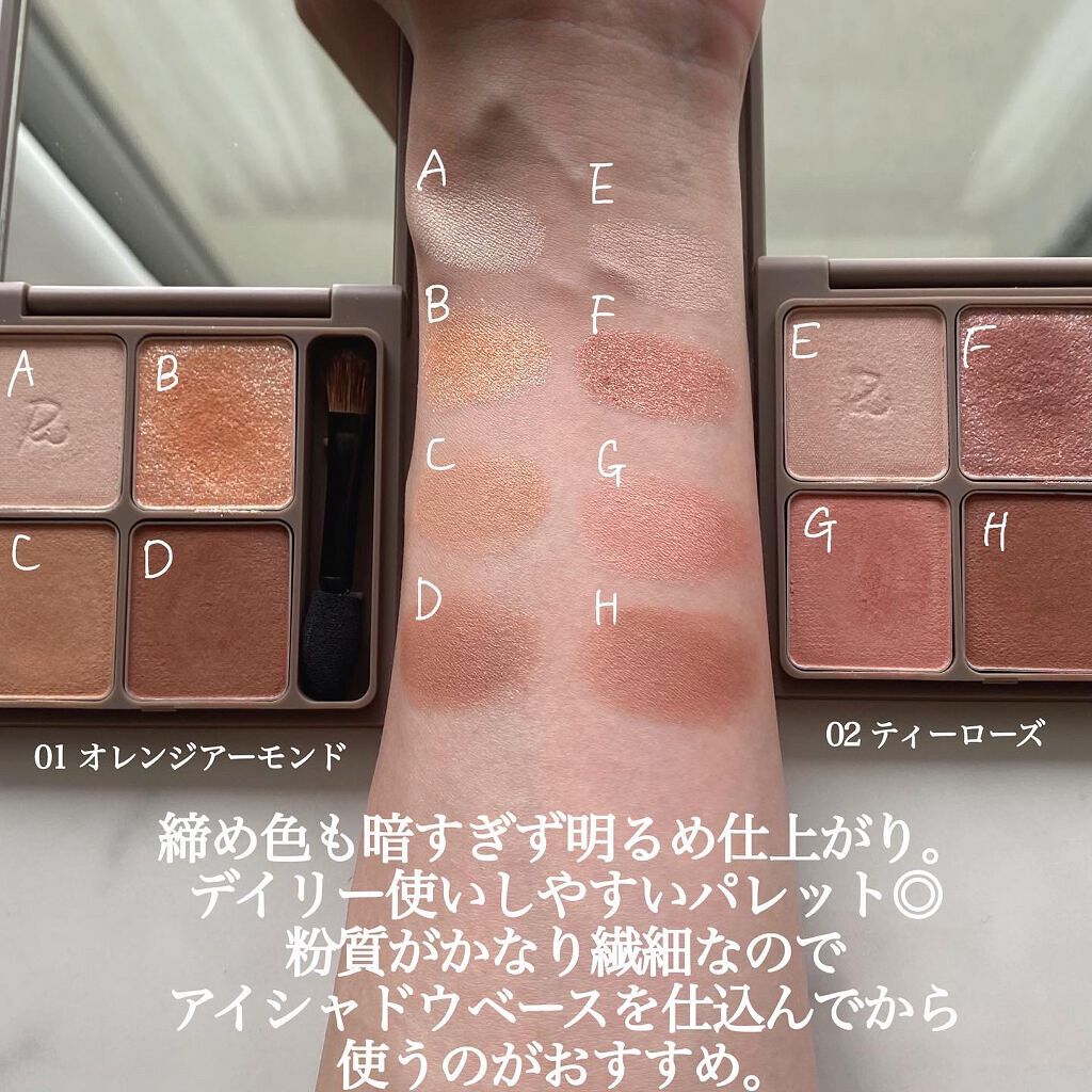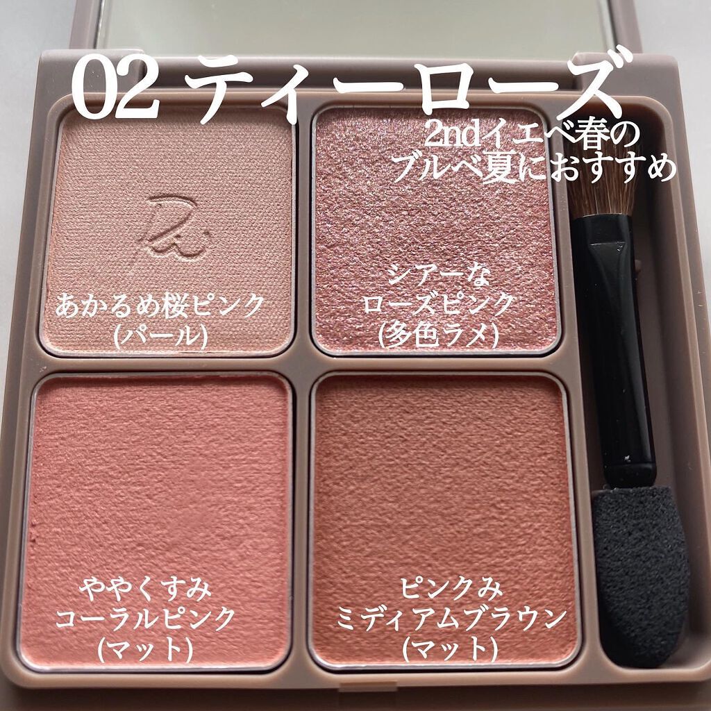 - 2021年3月15日(月)予約販売開始 色×光×質感を1つに詰め込み、毎日のアイメイクのバリエー ションを膨らませる4色のアイシャドウパレット。 ・発色・質感を調整しやすいチップ&ブラシ ふんわり仕上げたいときはブラシ しっかり発色させたいときはチップを その日の気分に合わせたアイメイクが楽しめる ・ 毎日のメイクが楽しくなる4つのカラー ・こだわりの3つの質感 シマー・プリズム・マットのテクスチャー それぞれのカラーがしっかり色づきピタッと密着 ●保湿美容液成分:セラミド・ヒアルロン酸・モモ葉エキス 配合。 ●ミラー・チップ&ブラシ付き。
