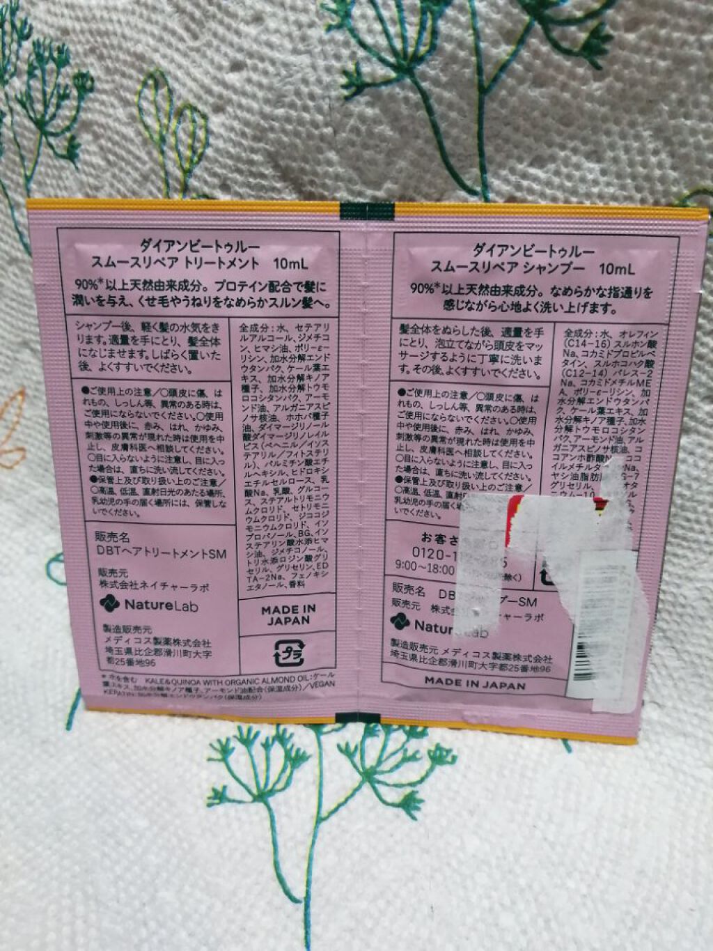 - 【シャンプー】水、オレフィン(C14-16)スルホン酸Na、コカミドプロピルベタイン、スルホコハク酸(C12-14)パレス-2Na、コカミドメチルMEA、ポリ-ε-リシン、加水分解エンドウタンパク、ケール葉エキス、加水分解キノア種子、加水分解トウモロコシタンパク、アーモンド油、アルガニアスピノサ核油、ココアンホ酢酸Na、ココイルメチルタウリンNa、ヤシ油脂肪酸PEG-7グリセリル、ポリクオタニウム-10、ポリソルベート20、DPG、BG、塩化Na、グリセリン、クエン酸、EDTA-2Na、安息香酸Na、フェノキシエタノール、香料【トリートメント】水、セテアリルアルコール、ジメチコン、ヒマシ油、ポリ-ε-リシン、加水分解エンドウタンパク、ケール葉エキス、加水分解キノア種子、加水分解トウモロコシタンパク、アーモンド油、アルガニアスピノサ核油、ホホバ種子油、ダイマージリノール酸ダイマージリノレイルビス(ベヘニル/イソステアリル/フィトステリル)、パルミチン酸エチルヘキシル、ヒドロキシエチルセルロース、乳酸Na、乳酸、グルコース、ステアルトリモニウムクロリド、セトリモニウムクロリド、ジココジモニウムクロリド、イソプロパノール、BG、イソステアリン酸水添ヒマシ油、ジメチコノール、トリ水添ロジン酸グリセリル、グリセリン、EDTA-2Na、フェノキシエタノール、香料