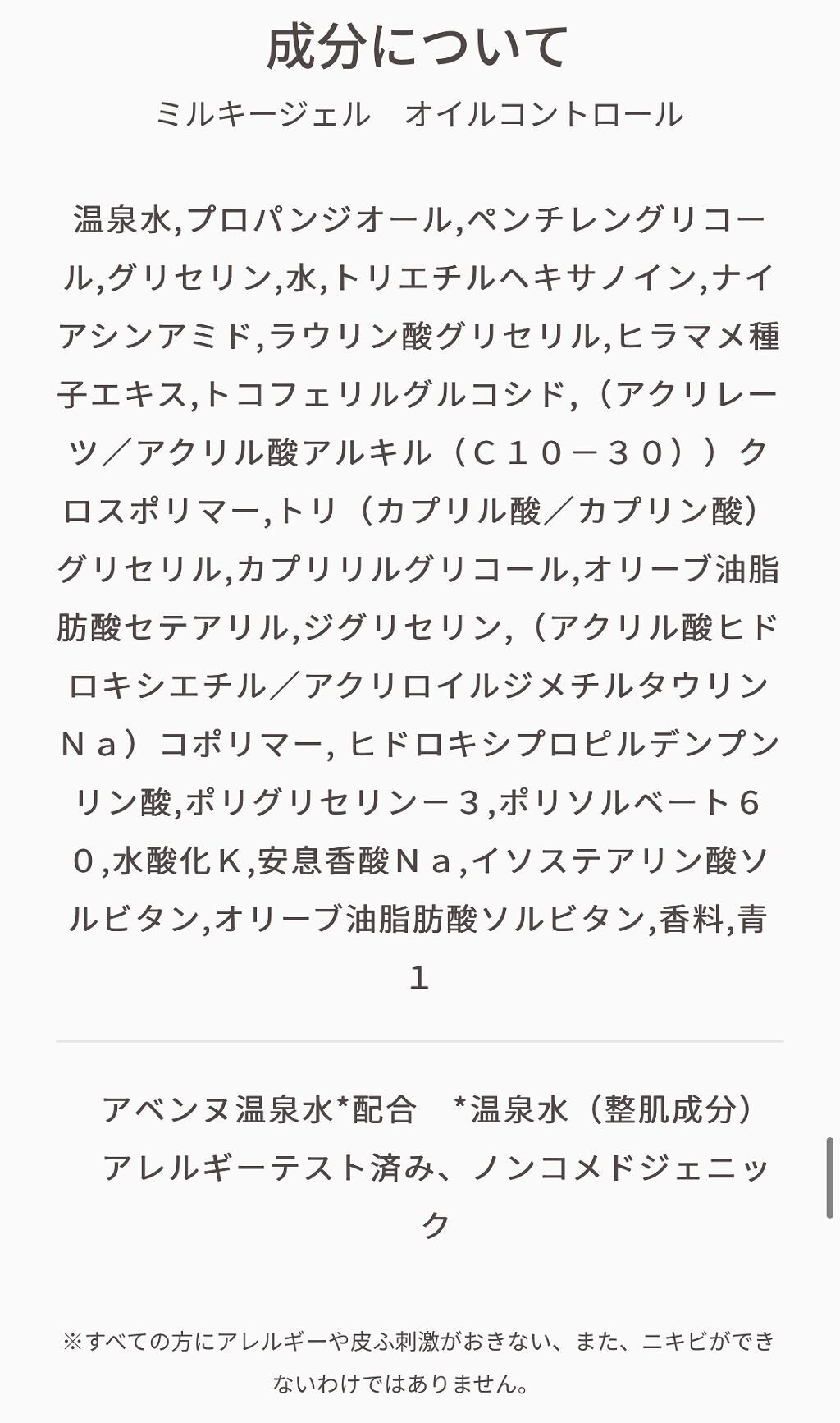 - <ミルキージェル オイルコントロール> 温泉水、プロパンジオール、ペンチレングリコール、グリセリン、水、トリエチルヘキサノイン、ナイアシンアミド、ラウリン酸グリセリル、ヒラマメ種子エキス、トコフェリルグルコシド、(アクリレーツ/アクリル酸アルキル(C10-30))クロスポリマー、トリ(カプリル酸/カプリン酸)グリセリル、カプリリルグリコール、オリーブ油脂肪酸セテアリル、ジグリセリン、(アクリル酸ヒドロキシエチル/アクリロイルジメチルタウリンNa)コポリマー、ヒドロキシプロピルデンプンリン酸、ポリグリセリン-3、ポリソルベート60、水酸化K、安息香酸Na、イソステアリン酸ソルビタン、オリーブ油脂肪酸ソルビタン、香料、青1