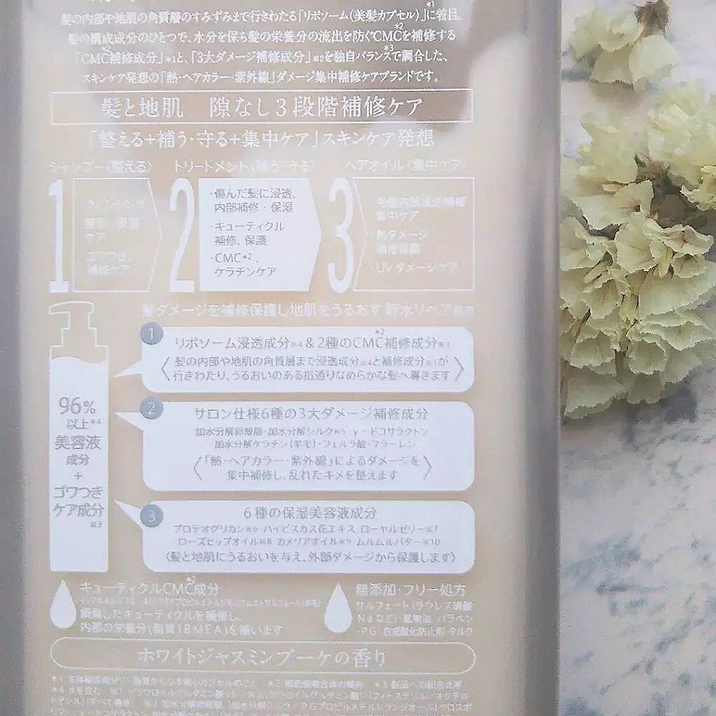 - 美容室メーカーが 366日かけて開発した 貯水リペア美容のぷるサラ髪 髪の内部や地肌の角質層のすみずみまで行きわたる「リポソーム(美髪カプセル)*1」に着目。 髪の構成成分のひとつで、水分を保ち髪の栄養分の流出を防ぐCMC*2 を補修する「CMC補修成分」※1と、 「3大ダメージ補修成分」※2 を独自バランス*3 で調合した、 スキンケア発想の「熱・ヘアカラー・紫外線」ダメージ集中補修ケアブランドです。 *1 生体組成成分リン脂質からなる微小カプセルのこと *2 細胞膜複合体の略称 *3 製品への配合比率 ※1 ジラウロイルグルタミン酸リシンNa、ラウロイルグルタミン酸ジ(フィトステリル/オクチルドデシル)(すべて補修) ※2 加水分解卵殻膜、リンゴ酸ジイソステアリル(シャンプーのみ)、(加水分解シルク/PGプロピルメチルシランジオール)クロスポリマー(トリートメント・ヘアオイル ・ヘアマスクのみ)、γ-ドコサラクトン、ココイル加水分解ケラチンK(羊毛)(シャンプーのみ)、加水分解ケラチン(羊毛)(トリートメント・ヘアオイル ・ヘアマスクのみ)、フェルラ酸、フラーレン(すべて補修)