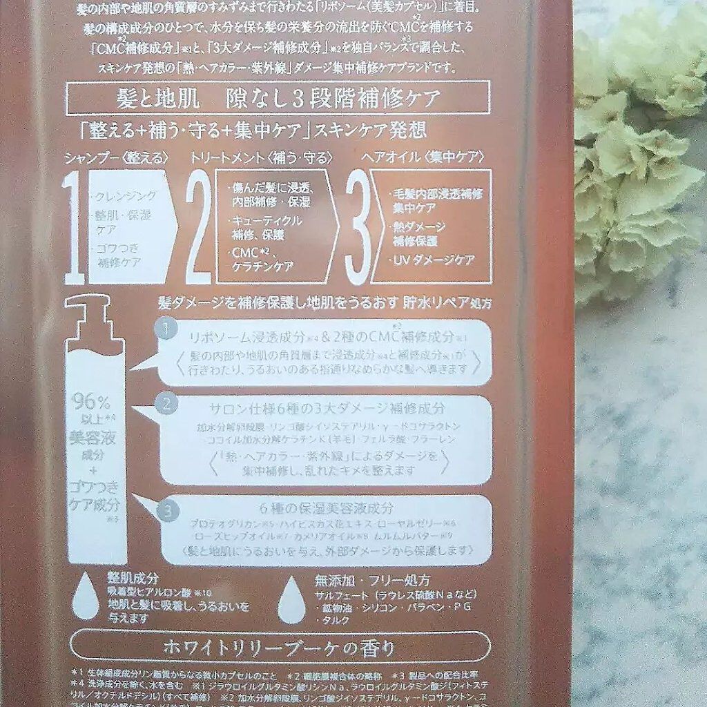 - <シャンプー 380mL> 水、ラウロイルメチルアラニンNa、ラウラミドプロピルベタイン、グリセリン、オレフィン(C14-16)スルホン酸Na、コカミドメチルMEA、コカミドプロピルベタイン、セラミドEOP、セラミドNG、セラミドNP、セラミドAG、セラミドAP、水添レシチン、フィトステロールズ、ジラウロイルグルタミン酸リシンNa、ラウロイルグルタミン酸ジ(フィトステリル/オクチルドデシル)、加水分解卵殻膜、リンゴ酸ジイソステアリル、γードコサラクトン、ココイル加水分解ケラチンK(羊毛)、フェルラ酸、フラーレン、加水分解コンキオリン、ヒアルロン酸ヒドロキシプロピルトリモニウム、ヒドロキシアパタイト、水溶性プロテオグリカン、ハイビスカス花エキス、ローヤルゼリーエキス、カニナバラ果実油、ツバキ種子油、アストロカリウムムルムル種子脂、ポリクオタニウムー10、ポリクオタニウムー7、スクワラン、アシル(C12,14)アスパラギンTEA、EDTA-2Na、クエン酸、安息香酸Na、セバシン酸ジエチル、メトキシケイヒ酸エチルヘキシル、ジエチルアミノヒドロキシベンゾイル安息香酸ヘキシル、トコフェロール、塩化Na、水酸化K、BG、DPG、PPGー7、メントール、フェノキシエタノール、赤227、黄4、香料 <トリートメント 360g> 水、セテアリルアルコール、ベヘントリモニウムクロリド、ジメチコン、セラミドEOP、セラミドNG、セラミドNP、セラミドAG、セラミドAP、水添レシチン、フィトステロールズ、ジラウロイルグルタミン酸リシンNa、ラウロイルグルタミン酸ジ(フィトステリル/オクチルドデシル)、加水分解卵殻膜、(加水分解シルク/PGプロピルメチルシランジオール)クロスポリマー、γードコサラクトン、加水分解ケラチン(羊毛)、フェルラ酸、フラーレン、加水分解コンキオリン、インアルキル(C10-40)アミドプロピルエチルジモニウムエトサルフェート(羊毛)、加水分解コラーゲン、加水分解ヒアルロン酸、水溶性プロテオグリカン、ハイビスカス花エキス、ローヤルゼリーエキス、カニナバラ果実油、ツバキ種子油、アストロカリウムムルムル種子脂、ポリクオタニウムー10、グリセリン、プロパンジオール、PVP、ペンテト酸5Na、クエン酸、クエン酸Na、安息香酸Na、PPGー8セテスー20、PPGー8セテスー10、ベヘントリモニウムメトサルフェート、ジココジモニウムクロリド、ステアルトリモニウムクロリド、ジステアリルジモニウムクロリド、イソプロパノール、ジフェニルシロキシフェニルトリメチコン、アモジメチコン、ジメチコノール、BG、フェノキシエタノール、セタノール、カラメル、黄4、香料 <シャンプー つめかえ 300mL> 水、ラウロイルメチルアラニンNa、ラウラミドプロピルベタイン、グリセリン、オレフィン(C14-16)スルホン酸Na、コカミドメチルMEA、コカミドプロピルベタイン、セラミドEOP、セラミドNG、セラミドNP、セラミドAG、セラミドAP、水添レシチン、フィトステロールズ、ジラウロイルグルタミン酸リシンNa、ラウロイルグルタミン酸ジ(フィトステリル/オクチルドデシル)、加水分解卵殻膜、リンゴ酸ジイソステアリル、γードコサラクトン、ココイル加水分解ケラチンK(羊毛)、フェルラ酸、フラーレン、加水分解コンキオリン、ヒアルロン酸ヒドロキシプロピルトリモニウム、ヒドロキシアパタイト、水溶性プロテオグリカン、ハイビスカス花エキス、ローヤルゼリーエキス、カニナバラ果実油、ツバキ種子油、アストロカリウムムルムル種子脂、ポリクオタニウムー10、ポリクオタニウムー7、スクワラン、アシル(C12,14)アスパラギンTEA、EDTA-2Na、クエン酸、安息香酸Na、セバシン酸ジエチル、メトキシケイヒ酸エチルヘキシル、ジエチルアミノヒドロキシベンゾイル安息香酸ヘキシル、トコフェロール、塩化Na、水酸化K、BG、DPG、PPGー7、メントール、フェノキシエタノール、赤227、黄4、香料 <トリートメント つめかえ 300g> 水、セテアリルアルコール、ベヘントリモニウムクロリド、ジメチコン、セラミドEOP、セラミドNG、セラミドNP、セラミドAG、セラミドAP、水添レシチン、フィトステロールズ、ジラウロイルグルタミン酸リシンNa、ラウロイルグルタミン酸ジ(フィトステリル/オクチルドデシル)、加水分解卵殻膜、(加水分解シルク/PGプロピルメチルシランジオール)クロスポリマー、γードコサラクトン、加水分解ケラチン(羊毛)、フェルラ酸、フラーレン、加水分解コンキオリン、インアルキル(C10-40)アミドプロピルエチルジモニウムエトサルフェート(羊毛)、加水分解コラーゲン、加水分解ヒアルロン酸、水溶性プロテオグリカン、ハイビスカス花エキス、ローヤルゼリーエキス、カニナバラ果実油、ツバキ種子油、アストロカリウムムルムル種子脂、ポリクオタニウムー10、グリセリン、プロパンジオール、PVP、ペンテト酸5Na、クエン酸、クエン酸Na、安息香酸Na、PPGー8セテスー20、PPGー8セテスー10、ベヘントリモニウムメトサルフェート、ジココジモニウムクロリド、ステアルトリモニウムクロリド、ジステアリルジ
