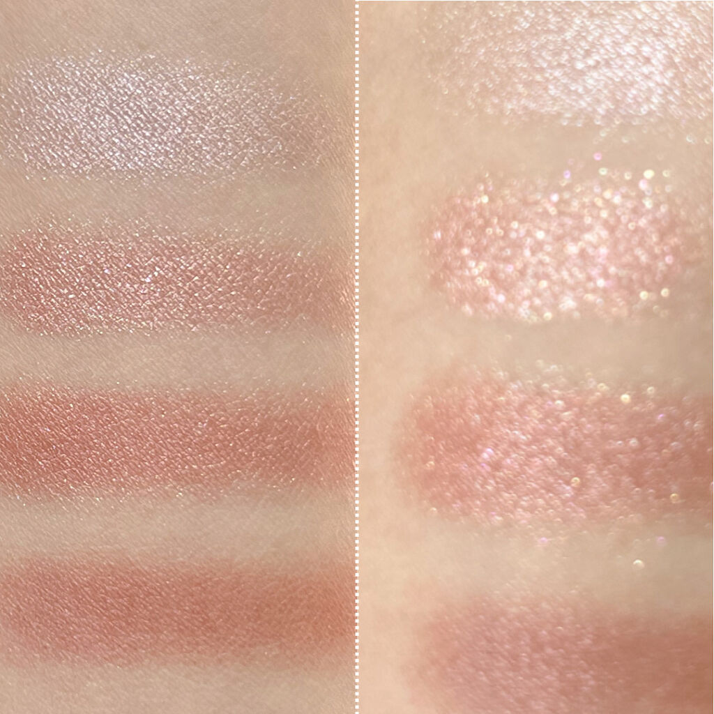 左上が細かいパールが入っていて目のくすみを飛ばしてくれる涙袋にのせるとめちゃくちゃぷっくり綺麗 右上はアイブロウに涙袋ラインにも使えるケバくならないようなお上品なカラー 左下ラメがナチュラルに透明感を与えてくれるような、上品な色ときらめき 右下ハイライトはめちゃくちゃつやんってなる! 左上のくすみが絶妙で使いやすいけど可愛いコーラル 右上は赤み強すぎず使いやすく感じた 左下ラメが可愛いカラー!嬉しい密着力! 右下ハイライトの肌なじみが良くて使いやすい