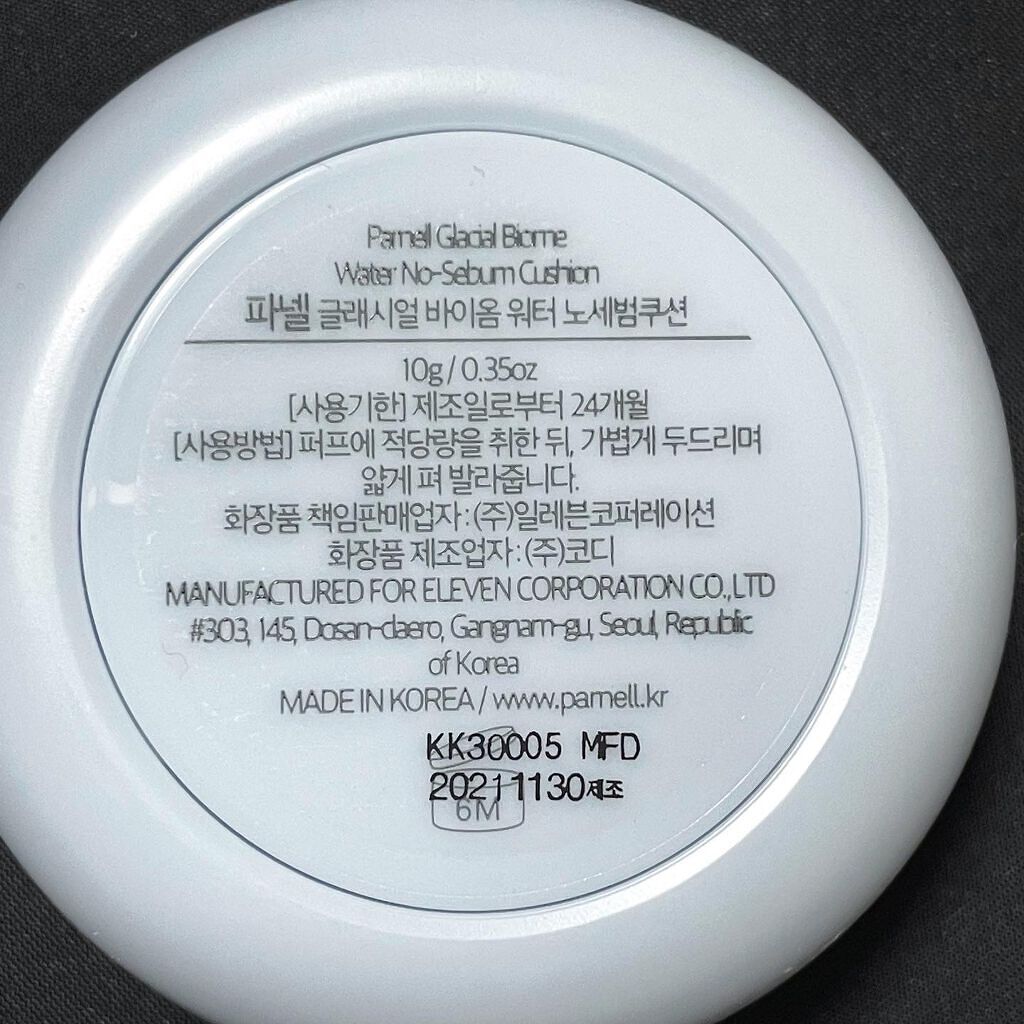 - <Glacial Biome Water No-Sebum Cushion> シリカ、水、BG、ジメチコン、ヒアルロン酸Na、キサンタンガム、トコフェロール、エチルヘキシルグリセリン、加水分解コラーゲン、オクテニルコハク酸デンプンAl、1,2-ヘキサンジオール、EDTA-2Na、加水分解エラスチン、ベントナイト、ビフィズス菌培養溶解質、シュードアルテロモナス発酵エキス、乳酸桿菌発酵液
