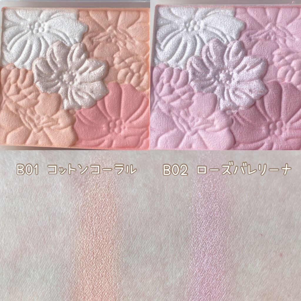 - <B01 コットンコーラル> トリイソステアリン酸ポリグリセリル-2、オクチルドデカノール、リンゴ酸ジイソステアリル、ヘキサ(ヒドロキシステアリン酸/ステアリン酸/ロジン酸)ジペンタエリスリチル、ミリスチン酸亜鉛、メタクリル酸メチルクロスポリマー、(HDI/トリメチロールヘキシルラクトン)クロスポリマー、テトライソステアリン酸ペンタエリスリチル、ビスジグリセリルポリアシルアジペート-2、ペンチレングリコール、フェノキシエタノール、シリカ、メチルパラベン、アルミナ、トコフェロール、ヒドロキシアパタイト、ポリメチルシルセスキオキサン、イソステアリン酸オクチルドデシル、水添ロジン酸ペンタエリスリチル、水、BG、エクトイン、ダマスクバラ花油、カニナバラ果実油、ヒアルロン酸Na、セラミドNP、ノイバラ果実エキス、ザクロ花エキス、トウキンセンカ花エキス、ローズマリー葉エキス、水溶性コラーゲン、ツボクサ葉エキス、タルク、合成フルオロフロゴパイト、酸化チタン、マイカ、酸化鉄、黄4、赤226、酸化スズ、ホホバエステル、トリヒドロキシステアリン <B02 ローズバレリーナ> トリイソステアリン酸ポリグリセリル-2、オクチルドデカノール、リンゴ酸ジイソステアリル、ヘキサ(ヒドロキシステアリン酸/ステアリン酸/ロジン酸)ジペンタエリスリチル、ミリスチン酸亜鉛、メタクリル酸メチルクロスポリマー、(HDI/トリメチロールヘキシルラクトン)クロスポリマー、テトライソステアリン酸ペンタエリスリチル、ビスジグリセリルポリアシルアジペート-2、ペンチレングリコール、フェノキシエタノール、シリカ、メチルパラベン、アルミナ、トコフェロール、ヒドロキシアパタイト、ポリメチルシルセスキオキサン、イソステアリン酸オクチルドデシル、水添ロジン酸ペンタエリスリチル、水、BG、エクトイン、ダマスクバラ花油、カニナバラ果実油、ヒアルロン酸Na、セラミドNP、ノイバラ果実エキス、ザクロ花エキス、トウキンセンカ花エキス、ローズマリー葉エキス、水溶性コラーゲン、ツボクサ葉エキス、タルク、合成フルオロフロゴパイト、マイカ、酸化チタン、酸化鉄、酸化スズ、赤226、ホホバエステル、グンジョウ、トリヒドロキシステアリン、赤202、マンガンバイオレット <B03 ラベンダードリーム> トリイソステアリン酸ポリグリセリル-2、オクチルドデカノール、リンゴ酸ジイソステアリル、ヘキサ(ヒドロキシステアリン酸/ステアリン酸/ロジン酸)ジペンタエリスリチル、ミリスチン酸亜鉛、メタクリル酸メチルクロスポリマー、(HDI/トリメチロールヘキシルラクトン)クロスポリマー、テトライソステアリン酸ペンタエリスリチル、ビスジグリセリルポリアシルアジペート-2、ペンチレングリコール、フェノキシエタノール、シリカ、メチルパラベン、アルミナ、トコフェロール、ヒドロキシアパタイト、ポリメチルシルセスキオキサン、イソステアリン酸オクチルドデシル、水添ロジン酸ペンタエリスリチル、水、BG、エクトイン、ダマスクバラ花油、カニナバラ果実油、ヒアルロン酸Na、セラミドNP、ノイバラ果実エキス、ザクロ花エキス、トウキンセンカ花エキス、ローズマリー葉エキス、水溶性コラーゲン、ツボクサ葉エキス、タルク、合成フルオロフロゴパイト、マイカ、酸化チタン、マンガンバイオレット、グンジョウ、酸化スズ、酸化鉄、赤226、赤202、ホホバエステル、トリヒドロキシステアリン、水酸化Al