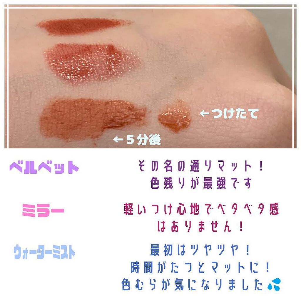 ベルベットという名前の通りマットな質感! そしてめちゃくちゃ落ちにくいです! グロスのようなちゅるちゅるの質感! サラサラのつけ心地で、ベタベタ感や重たさはないです🙆♀️ 最初はツヤ感のあるテクスチャーなのに時間がたつとマットに変わっていきます🌈 面白いリップですが、ツヤからマットに変わっていくからかムラになりやすく感じました🥺