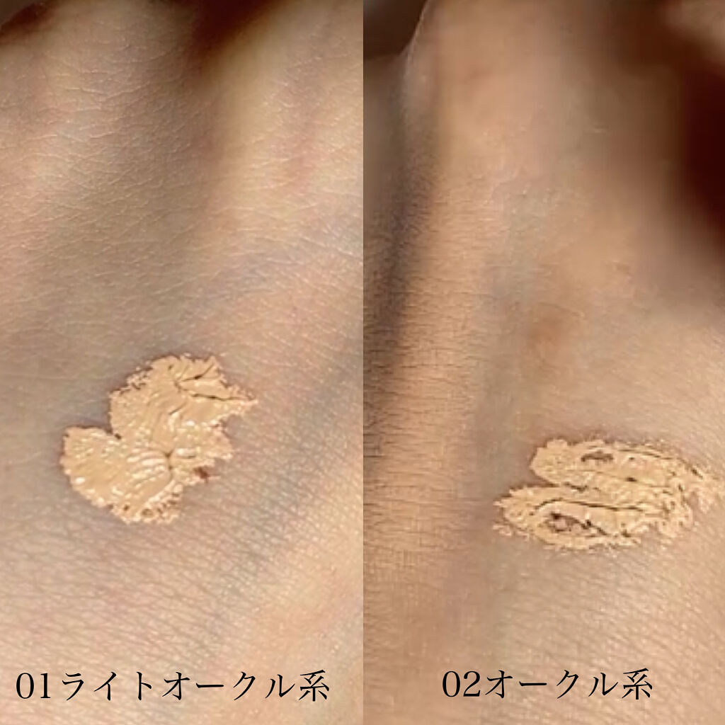- <01 ライトオークル> 水、シクロペンタシロキサン、セチルPEG/PPG-10/1ジメチコン、グリセリン、BG、トリメチルシロキシケイ酸、ペンチレングリコール、リンゴ酸ジイソステアリル、ジイソステアリン酸ポリグリセリル-2、ジエチルヘキサン酸ネオペンチルグリコール、ジグリセリン、ベタイン、ポリメチルシルセスキオキサン、硫酸Mg、マイカ、ジメチコン、ソルビトール、フェノキシエタノール、ジフェニルシロキシフェニトリメチコン、(ジメチコン/ビニルジメチコン)クロスポリマー、トコフェロール、ヒアルロン酸Na、オリーブ果実油、ホホバ種子油、メドウフォーム油、パルミチン酸レチノール、コーン油、クダモノトケイソウ果実エキス、アロエベラ葉エキス、(+/−)酸化チタン、タルク、酸化鉄、水酸化Al、トリエトキシカプリリルシラン、ステアリン酸 <02 オークル> 水、シクロペンタシロキサン、セチルPEG/PPG-10/1ジメチコン、グリセリン、BG、トリメチルシロキシケイ酸、ペンチレングリコール、リンゴ酸ジイソステアリル、ジイソステアリン酸ポリグリセリル-2、ジエチルヘキサン酸ネオペンチルグリコール、ジグリセリン、ベタイン、ポリメチルシルセスキオキサン、硫酸Mg、マイカ、ジメチコン、ソルビトール、フェノキシエタノール、ジフェニルシロキシフェニルトリメチコン、(ジメチコン/ビニルジメチコン)クロスポリマー、トコフェロール、ヒアルロン酸Na、オリーブ果実油、ホホバ種子油、メドウフォーム油、パルミチン酸レチノール、コーン油、クダモノトケイソウ果実エキス、アロエベラ葉エキス、(+/−)酸化チタン、タルク、酸化鉄、水酸化Al、トリエトキシカプリリルシラン、ステアリン酸
