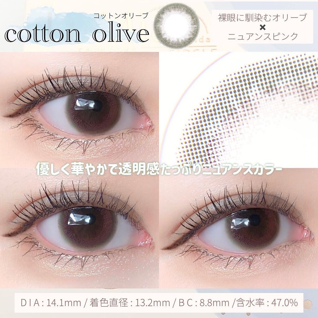 KuMiaコットンオリーブ半額クーポンで購入✨度数は0.5きざみハイドロゲル素材🫧裸眼よりフチの色素が薄くなって儚い雰囲気になれる裸眼風コンタクト淡い発色のオリーブにピンクのハイライトハイライトはなじんであんまりわかりません😌裸眼より色素が薄...