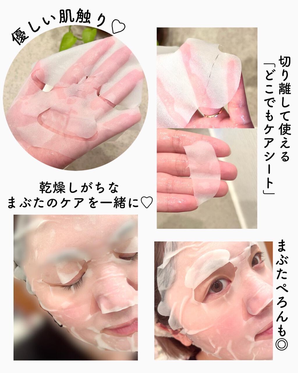 肌あたりのやさしいやわらかシートでまぶたも小鼻もスキなくフィット!しっかり肌を包み込んでくれるようなシートマスクだよ😊 切りはなして使えるどこでもケアシートがついてるの!これまた便利で目まわりや口もと、小鼻わきなど隙間が気になるところに使えるの! パックのあとはお肌うるるん♩しっとりするのにベタつきを感じないよ。