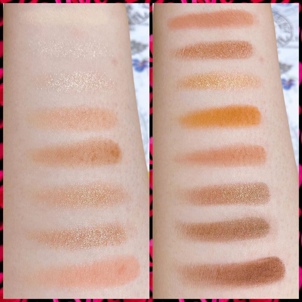 少量でも凄い発色が良いので少しずつ色を取り調整した方が良いと思います! 右上はベージュ系の色味なので右側のみで使用したらデイリーメイクにもピッタリです! 左下も発色は良いけども透明感のある色味なのでポイントとして使用するととても可愛いです♡
