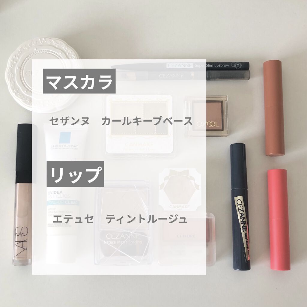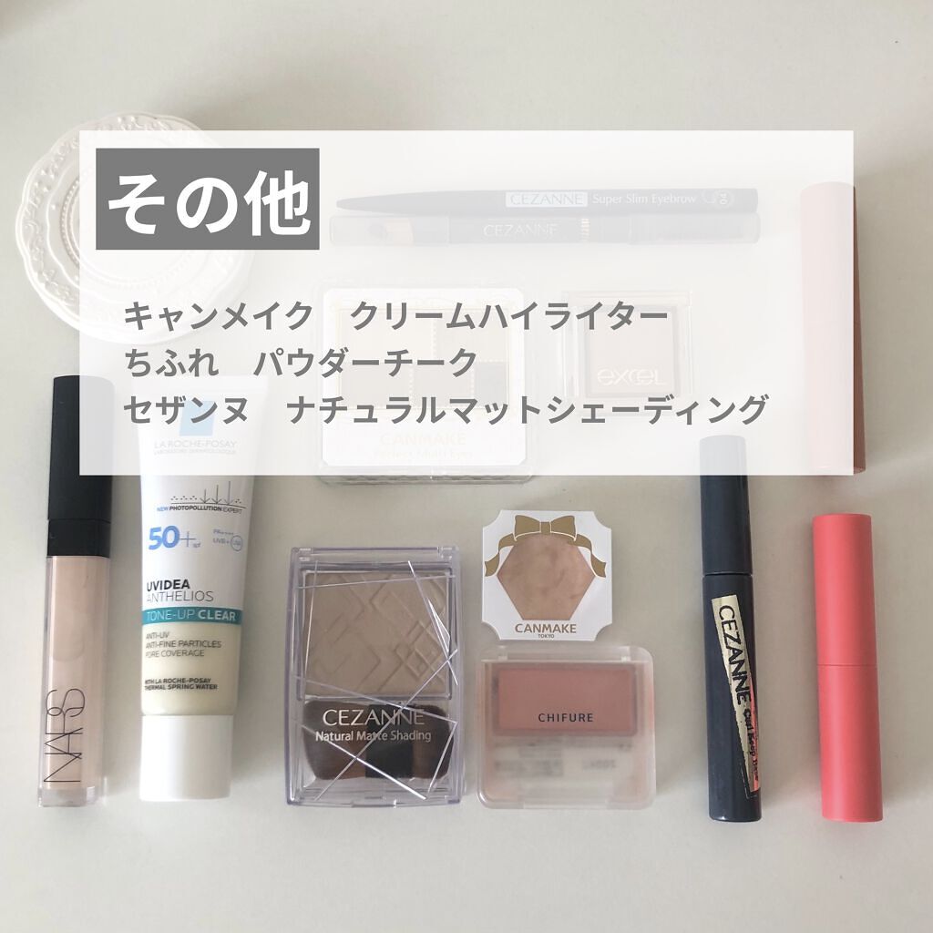 ベースメイクだけは少し高いものを使います。密着感や崩れ方の汚くなさが段違いなので、ベースメイクにはお金を掛けるのがおすすめです! セザンヌの細芯アイブロウと鉛筆のやつです。また、キャンメイクパーフェクトマルチアイズの1番濃い色を眉毛に使うのおすすめです! エクセルの「ショートホイップ」一個前の投稿で紹介しているので見て欲しいです。