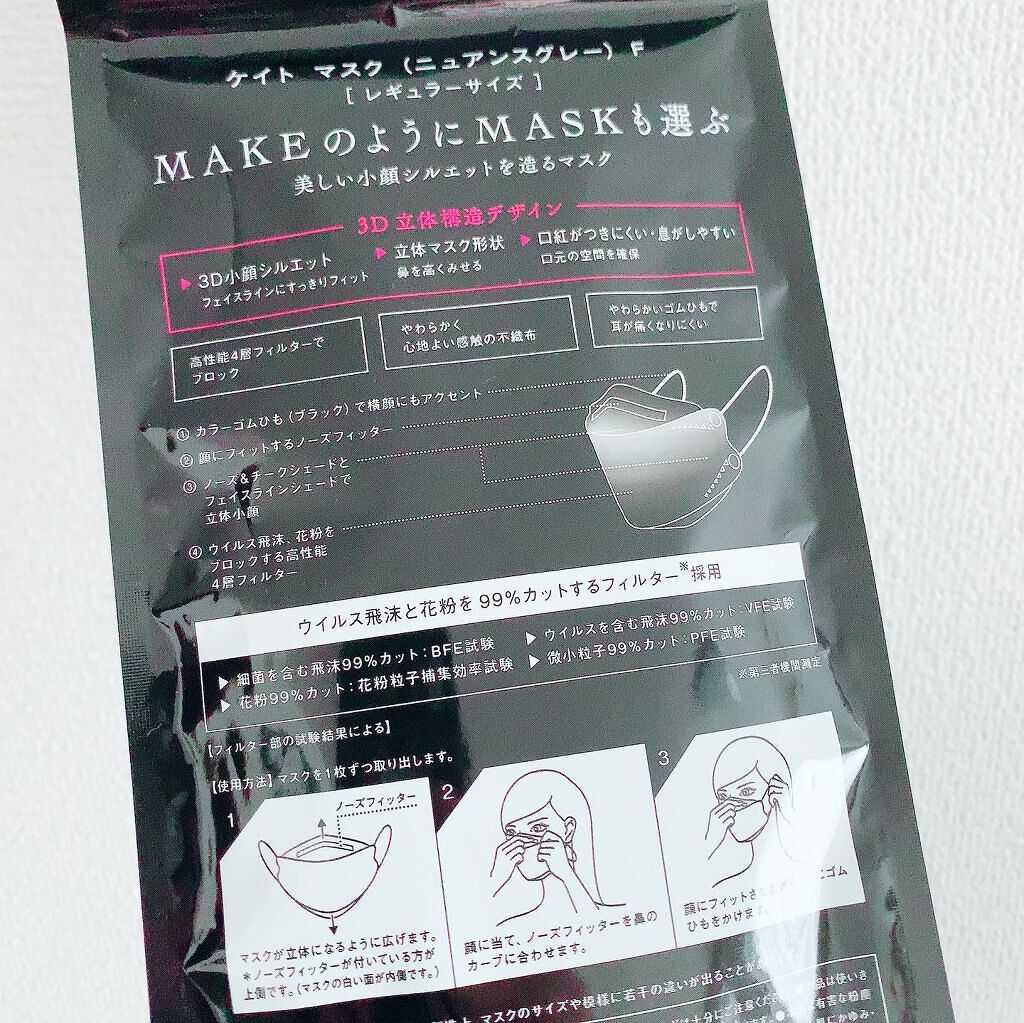 KATEから不織布の「新・小顔シルエットマスク」が登場! KATE マスク F781円(税込)色は、ラベンダー/ミルクティーブラウン/ロゼピンク/ニュアンスグレーの4色展開で今回はロゼピンクを体験中。「ケイト マスク F」は、色影マジックでシ...