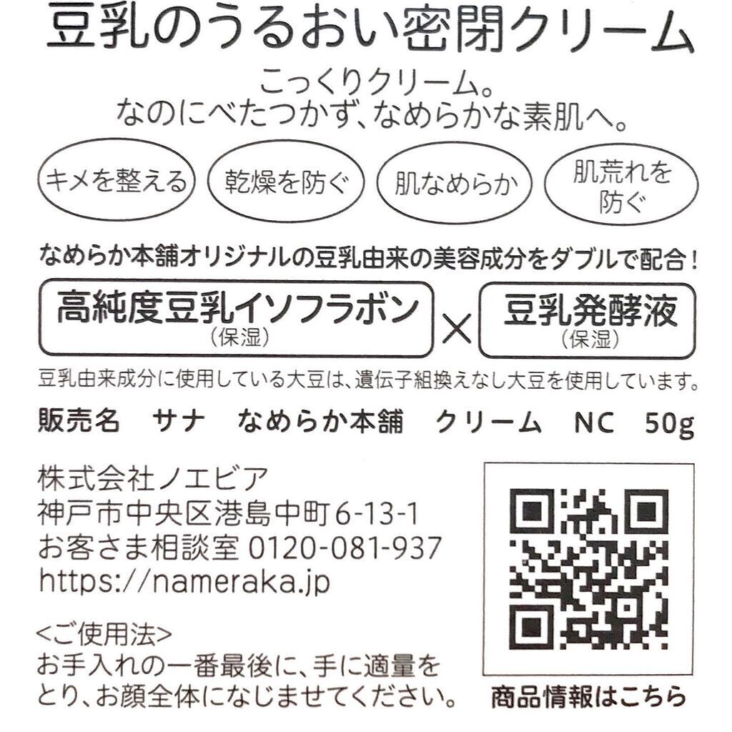 - <クリーム NC> 水、BG、グリセリン、キサンタンガム、カルボマー、メチルパラベン、スクワラン、ミツロウ、エタノール、ステアリン酸、セタノール、シクロペンタシロキサン、水酸化Na、クエン酸、ステアリルアルコール、ダイズ種子エキス、酢酸トコフェロール、シクロデキストリン、パルミチン酸、オクテニルコハク酸デンプンAl、ステアリン酸グリセリル(SE)、豆乳発酵液、ダイズタンパク、シクロヘキサシロキサン、ステアリン酸PEG-25、豆乳イソフラボン