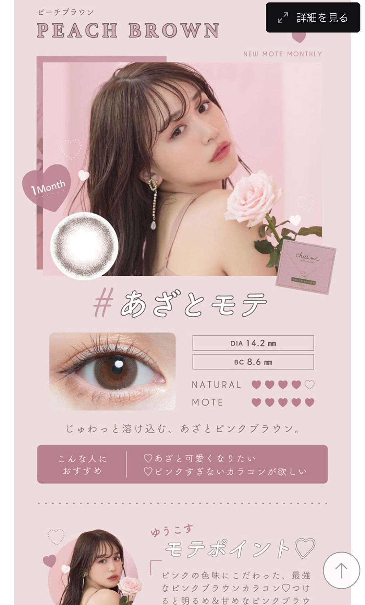 - ※2025年10月中旬より、商品パッケージ順次リニューアル。(レンズスペック・その他情報は変更ございません)尚、パッケージリニューアルに伴う商品の返品・交換は承っておりません。 まるでティントで染めたように色づく、こだわりの「あざと盛れレンズ」が登場 細すぎず、太すぎない絶妙なちゅるんフチとジューシーな色めくティントカラーで、こだわりのあざと盛れレンズがマンスリー限定色としてラインナップに加わりました。 近年ではカラーコンタクトを選ぶときにパーソナルカラーを重視するというユーザーからの意見を参考に商品開発を行い、イエベさんにはつやめく甘みベージュのメロウキャメル、ブルべさんには色っぽさ溢れるミューテッドグレージュがそれぞれの魅力を引き立てるカラーとなっております。 お好きなスタイルやメイクに合わせてお楽しみください。 ●BABY BROWN(ベイビーブラウン) 赤ちゃんの瞳のような透明感演出。ピュアな裸眼系ブラウン。 ●PEACH BROWN(ピーチブラウン) じゅわっと溶け込むように馴染む、あざとピンクブラウン。 ●HONEY BEIGE(ハニーベージュ) 透明感があふれだす、儚げラテベージュ。 ●CHIFFON BROWN(シフォンブラウン) アンニュイな透け感がポイント。ふわっと色素薄い系ブラウン。 ●MOIST BROWN(モイストブラウン) 茶フチが演出する”うるおい”感。甘え上手なちゅるんブラウン。 ●MELLOW CAMEL(メロウキャメル) ちゅるんとしたティントカラーに惹き込まれる 甘ツヤうぶベージュ。 ●MUTED GREIGE(ミューテッドグレージュ) 透明感たっぷりのくすみカラーで 仕上げる色っぽグレージュ。 ●BRULEE CHARM(ブリュレチャーム) 瞳をくりっと見せる濃厚フチ、溶け込むとろ甘焦がしブラウン。 ●BABY MORE(ベイビーモア) ベイビーブラウンのサイズアップ♡ もっとちゅるんと盛れ感をプラス、愛されモテブラウン。 カラーコンタクトレンズの不適正使用による眼障害の危険性等などがあります。 ●コンタクトレンズは高度管理医療機器です。不十分な洗浄・消毒など不適切なケアや、長時間・交換期間を超えた装用により、アレルギー性結膜炎、角膜感染症、角膜潰瘍等の重篤な眼障害が発生する危険性があります ●ご使用前に取扱説明書を確認してください 使用上の留意事項 ●眼科医院等を受診してからお求めください ●眼に異常を感じたら直ちにレンズ使用を中止し、お近くの眼科等で診察を受けてください ●医師の指示にしたがってご使用ください ●コンタクトレンズを装用する場合、自覚症状がなくても、眼科医院等での定期検査を受けてください ●レンズに不具合がある場合は使用しないでください