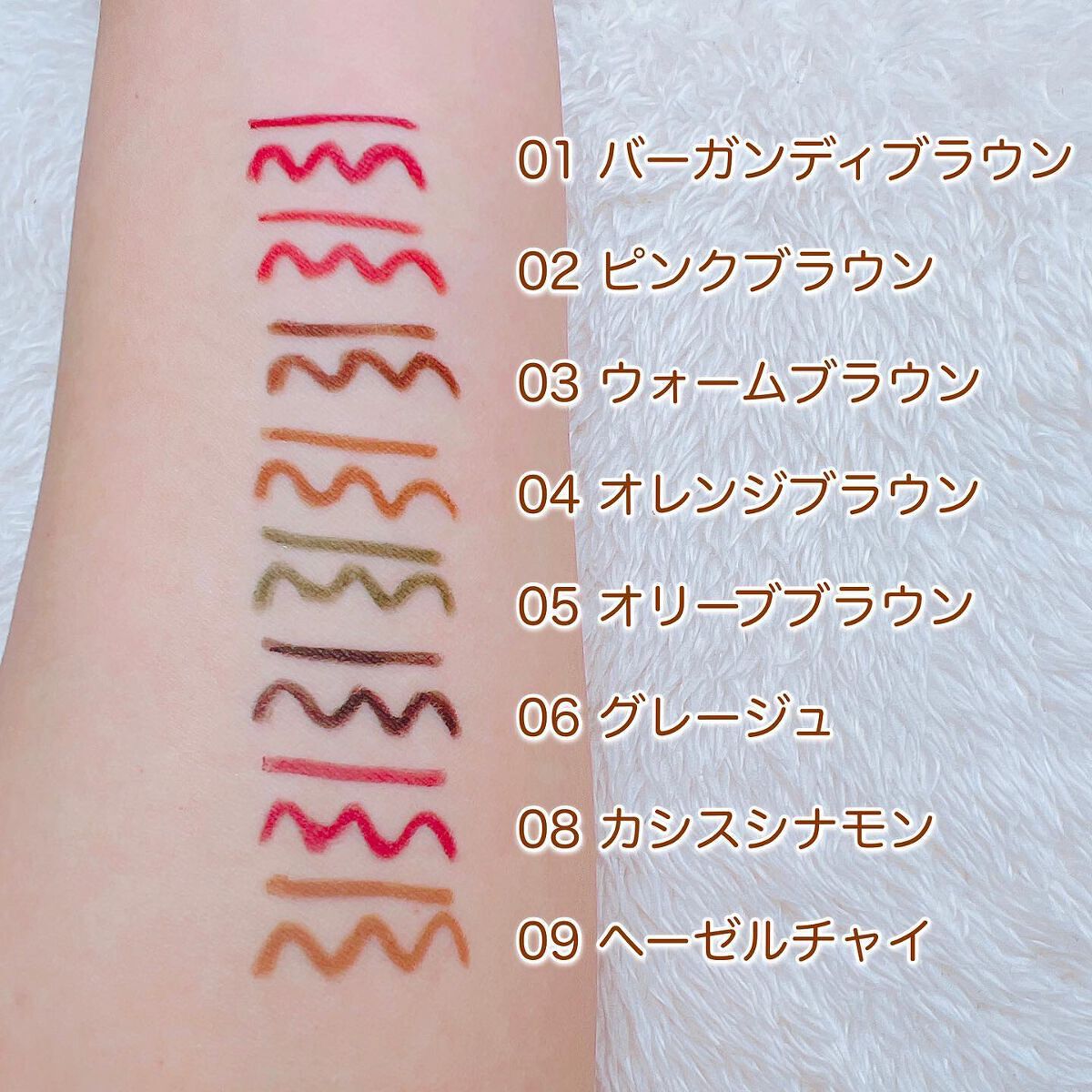 - <02 ピンクブラウン> トリメチルシロキシケイ酸、メチルトリメチコン、ポリエチレン、(アクリレーツ/アクリル酸ステアリル/メタクリル酸ジメチコン)コポリマー、カルナウバロウ、キャンデリラロウ、スクワラン、ホホバ種子油、トリイソステアリン酸ポリグリセリル-2、水酸化Al、ジメチコン、トコフェロール、酸化鉄、酸化チタン、マイカ、グンジョウ <03 ウォームブラウン> トリメチルシロキシケイ酸、メチルトリメチコン、ポリエチレン、(アクリレーツ/アクリル酸ステアリル/メタクリル酸ジメチコン)コポリマー、カルナウバロウ、キャンデリラロウ、スクワラン、ホホバ種子油、トリイソステアリン酸ポリグリセリル-2、ジメチコン、トコフェロール、水酸化Al、酸化鉄、マイカ、酸化チタン、グンジョウ <04 オレンジブラウン> トリメチルシロキシケイ酸、メチルトリメチコン、ポリエチレン、(アクリレーツ/アクリル酸ステアリル/メタクリル酸ジメチコン)コポリマー、カルナウバロウ、キャンデリラロウ、スクワラン、ホホバ種子油、トリイソステアリン酸ポリグリセリル-2、ジメチコン、水酸化Al、トコフェロール、酸化鉄、グンジョウ、マイカ、酸化チタン <06 グレージュ> トリメチルシロキシケイ酸、メチルトリメチコン、ポリエチレン、(アクリレーツ/アクリル酸ステアリル/メタクリル酸ジメチコン)コポリマー、カルナウバロウ、キャンデリラロウ、スクワラン、ホホバ種子油、トリイソステアリン酸ポリグリセリル-2、水酸化Al、ジメチコン、トコフェロール、酸化鉄、酸化チタン、マイカ、グンジョウ <09 ヘーゼルチャイ> イソドデカン、トリメチルシロキシケイ酸、合成ワックス、(アクリレーツ/アクリル酸ステアリル/メタクリル酸ジメチコン)コポリマー、カルナウバロウ、ジフェニルシロキシフェニルトリメチコン、スクワラン、ホホバ種子油、ジメチコン、水酸化Al、トコフェロール、酸化鉄、酸化チタン、マイカ、グンジョウ <18 アプリコットブラウン> イソドデカン、トリメチルシロキシケイ酸、合成ワックス、(アクリレーツ/アクリル酸ステアリル/メタクリル酸ジメチコン)コポリマー、カルナウバロウ、ジフェニルシロキシフェニルトリメチコン、ホウケイ酸(Ca/Al)、スクワラン、ホホバ種子油、ジメチコン、水酸化Al、トコフェロール、酸化スズ、酸化鉄、マイカ、酸化チタン、グンジョウ <19 インディゴブラック> イソドデカン、トリメチルシロキシケイ酸、合成ワックス、(アクリレーツ/アクリル酸ステアリル/メタクリル酸ジメチコン)コポリマー、カルナウバロウ、ジフェニルシロキシフェニルトリメチコン、ジメチコン、トコフェロール、スクワラン、ホホバ種子油、水酸化Al、酸化鉄、マイカ、グンジョウ、酸化チタン、ホウケイ酸(Ca/Al)、酸化スズ <01 バーガンディブラウン> トリメチルシロキシケイ酸、メチルトリメチコン、ポリエチレン、(アクリレーツ/アクリル酸ステアリル/メタクリル酸ジメチコン)コポリマー、カルナウバロウ、キャンデリラロウ、スクワラン、ホホバ種子油、トリイソステアリン酸ポリグリセリル-2、水酸化Al、ジメチコン、トコフェロール、酸化鉄、グンジョウ、酸化チタン、マイカ <05 オリーブブラウン> トリメチルシロキシケイ酸、メチルトリメチコン、ポリエチレン、(アクリレーツ/アクリル酸ステアリル/メタクリル酸ジメチコン)コポリマー、カルナウバロウ、キャンデリラロウ、スクワラン、ホホバ種子油、トリイソステアリン酸ポリグリセリル-2、ジメチコン、トコフェロール、水酸化Al、酸化鉄、グンジョウ、マイカ、酸化チタン <08 カシスシナモン> カシスシナモン トリメチルシロキシケイ酸、メチルトリメチコン、ポリエチレン、(アクリレーツ/アクリル酸ステアリル/メタクリル酸ジメチコン)コポリマー、カルナウバロウ、キャンデリラロウ、スクワラン、ホホバ種子油、トリイソステアリン酸ポリグリセリル-2、水酸化Al、ジメチコン、トコフェロール、酸化鉄、グンジョウ、酸化チタン、マイカ <10 ピスタチオキャメル> トリメチルシロキシケイ酸、メチルトリメチコン、ポリエチレン、(アクリレーツ/アクリル酸ステアリル/メタクリル酸ジメチコン)コポリマー、カルナウバロウ、トリイソステアリン酸ポリグリセリル-2、キャンデリラロウ、スクワラン、ホホバ種子油、ジメチコン、水酸化Al、トコフェロール、マイカ、酸化鉄、酸化チタン、グンジョウ、コンジョウ <11 ロゼウッド> トリメチルシロキシケイ酸、メチルトリメチコン、ポリエチレン、(アクリレーツ/アクリル酸ステアリル/メタクリル酸ジメチコン)コポリマー、カルナウバロウ、トリイソステアリン酸ポリグリセリル-2、キャンデリラロウ、スクワラン、ホホバ種子油、ジメチコン、水酸化Al、トコフェロール、マイカ、酸化鉄、酸化チタン <13 ミモザブラウン> トリメチルシロキシケイ酸、メチルトリメチコン、合成ワックス、(アクリレーツ/アクリル酸ステアリル/メタクリル酸ジメチコン)コ