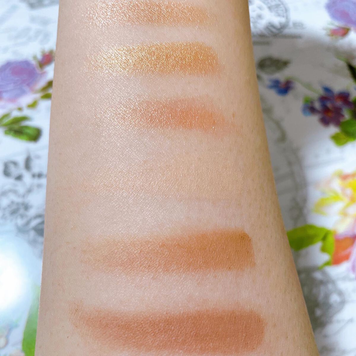 コーラルベース × ゴールドパール × ホワイトパールの3色の組み合わせです!! コーラル系がベースなので日本人の肌に とても馴染むと思います! こちらも薄付きなのでチークは勿論ハイライトとしても使用出来ます! 下瞼から目尻に掛けて塗ればマスク生活でも華やかな目元に仕上がります! コーラル系なので肌を白く見せてくれる色味だと思いました! 使用感も柔かく しっとりしているので保湿効果もあります! デイリーメイクに使いやすい色だと思いました。 目元とリップに重ねると顔全体が統一感が出るので可愛いく仕上げる事が出来ます♡ 写真よりも実際は色味が もっとしっかり出るのでその日の気分によって色の濃さを調整しやすいと思います!