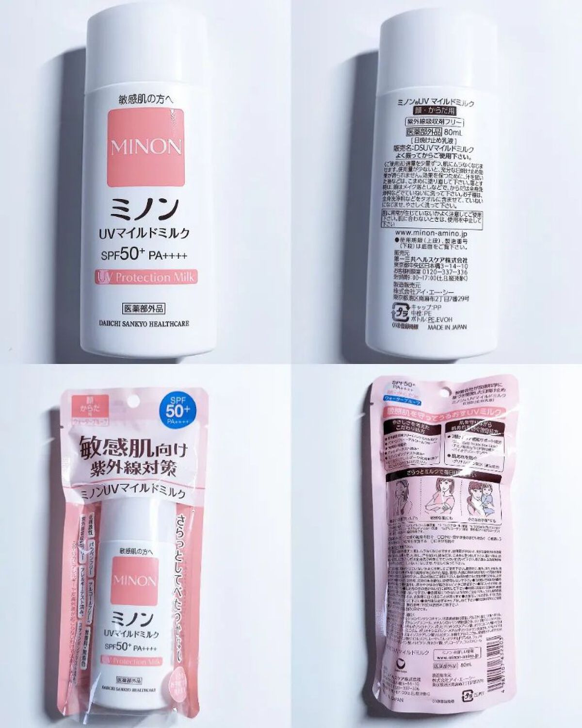 - <ミノンUVマイルドミルク> グリチルリチン酸2K、デカメチルシクロペンタシロキサン、低温焼成酸化亜鉛、パルミチン酸2-エチルヘキシル、微粒子酸化チタン、1,3-ブチレングリコール、メチルシロキサン網状重合体、リンゴ酸ジイソステアリル、グリセリルグルコシド液、メチルポリシロキサン、ポリヒドロキシステアリン酸、オクテニルコハク酸トウモロコシデンプンエステルアルミニウム、ポリオキシエチレン・メチルポリシロキサン共重合体、メチルハイドロジェンポリシロキサン、セスキイソステアリン酸ソルビタン、水酸化アルミニウム、架橋型メチルポリシロキサン、ラウロイルグルタミン酸ジ(コレステリル・ベヘニル・オクチルドデシル)、フェノキシエタノール、セスキオレイン酸ソルビタン、含水ケイ酸、グリコーゲン、コレステロール