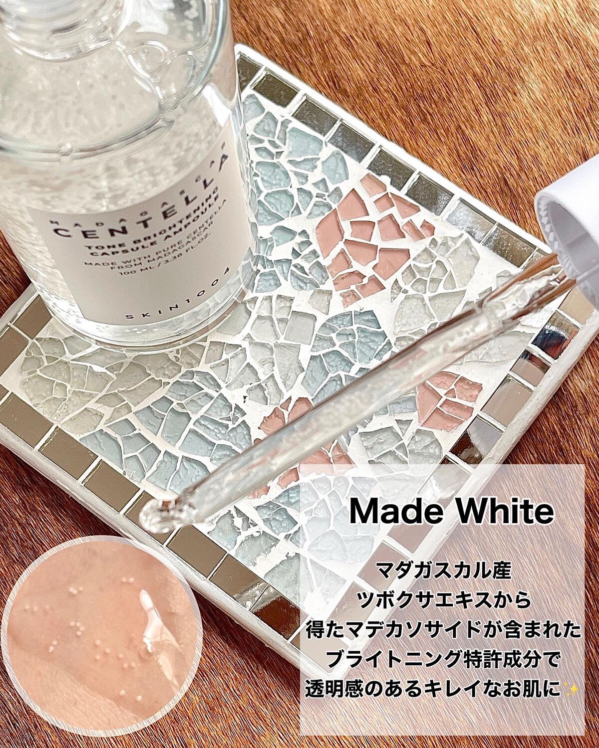 マダガスカル産のCICA成分をふんだんに配合した美容液だよ。 とろみのあるテクスチャーで、お肌にスーッとのびてゆっくりなじみ、べたつきなくさっぱりしっとりするよ。 ナイアシンアミドやトラネキサム酸などが保湿成分として含まれてるからキメがととのうことで明るく輝くようなお肌に導いてくれるよ。