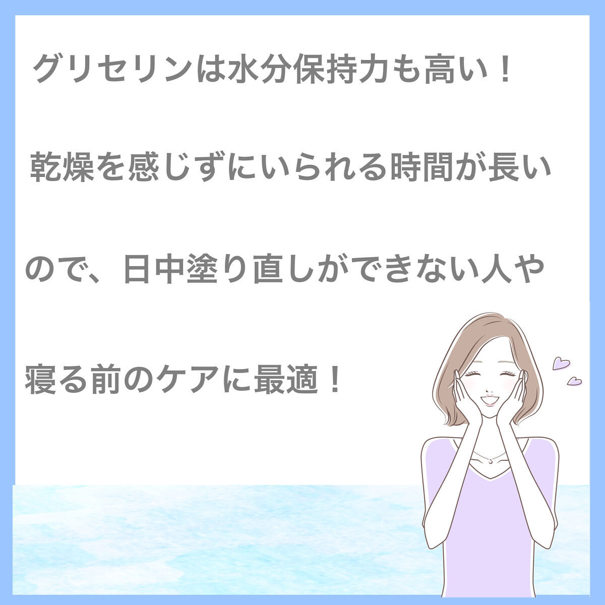 - 手洗いや消毒などで荒れた手に(微香) 角層のすみずみまですばやく浸透*1 濃厚な保湿力で乾燥をケア 高保湿 なめらかローションタイプ 微香 純度99%グリセリン*2が角層10層の奥まで浸透し、乾燥肌でも1日中うるおいをキープ。 自らの何倍もの水分を保持するグリセリンを配合しているから、肌に十分なうるおいをもたらし、柔らかさとなめらかさを1日中保ちます。 軽いテクスチャーで使用後もベタつかないため、日中の使用にもぴったり。 *1 角層まで *2 保湿成分 フランス製