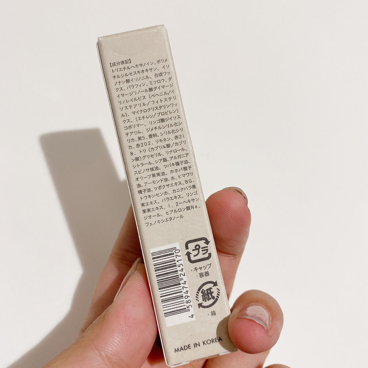 - トリエチルヘキサノイン、ポリメチルシルセスキオキサン、イソノナン酸イソノニル、合成ワックス、パラフィン、ミツロウ、ダイマージリノール酸ダイマージリノレイルビス(ベヘニル/イソステアリル/フィトステリル)、マイクロクリスタリンワックス、(エチレン/プロピレン)コポリマー、リンゴ酸ジイソステアリル、ジメチルシリル化シリカ、黄5、香料、シリル化シリカ、赤202、リモネン、赤218、トリ(カプリル酸/カプリン酸)グリセリル、リナロール、シトラール、シア脂、アルガニアスピノサ核油、ツバキ種子油、オリーブ果実油、ホホバ種子油、アーモンド油、水、ヒマワリ種子油、ツボクサエキス、BG、トウキンセンカ、カニナバラ果実エキス、バラエキス、リンゴ果実エキス、1,2-ヘキサンジオール、ヒアルロン酸Na、フェノキシエタノール
